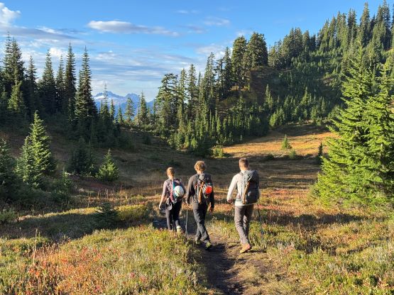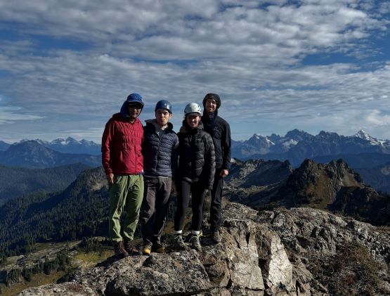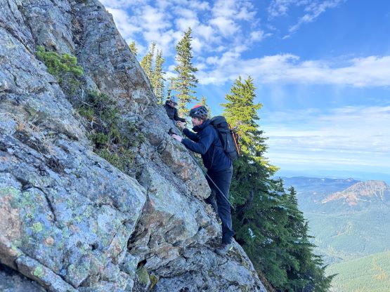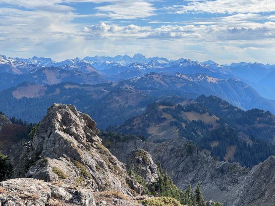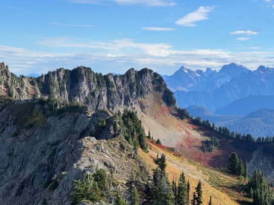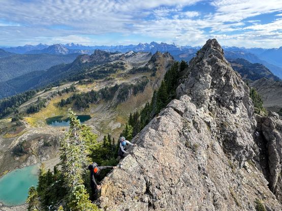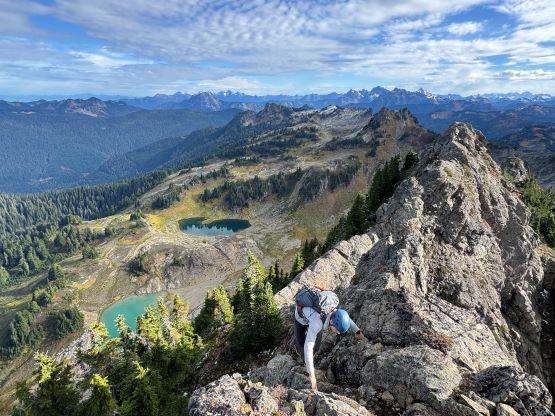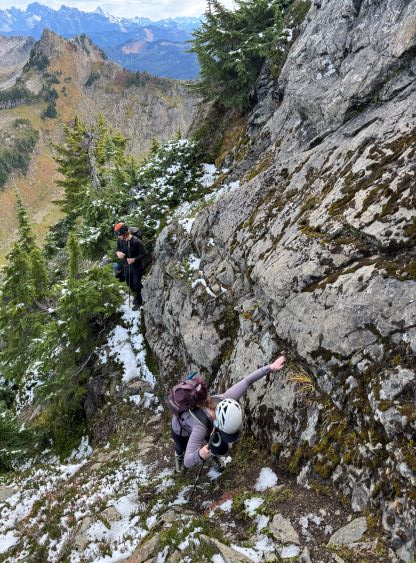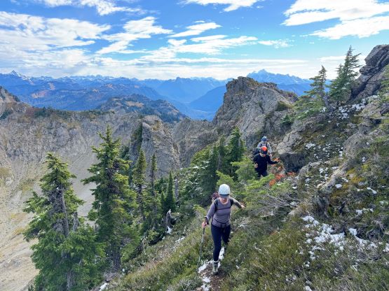 We shouldered the heavy ass packs and started the approach. The Washingtonians do maintain their trails at an unbelivable standard that even this mediocre destination has a trail with quality no worse than the Garibaldi Lake’s. I did think there were too many switchbacks and I would prefer the trail to be shorter but steeper, but in any case it didn’t take us long to reach the meadows at 1500 m elevation. We took a break donning sun protection and then took our time grunting upwards to the old fire lookout. For the last 20 m elevation gain we took the decommissioned “cable route” that involved some scrambling. Most of the hikers would stop at this point but that’s considered unacceptable for us. In fact, a simple search in Washington’s Church Mountain results in more trip reports claiming “Church Mountain” by only reaching the old lookout site. What a shame. The warm temperatures had apparently done us a favour by melting most of the new snow, that the entire south face of the summit scramble appeared bone dry. We nevertheless decided to carry all of the gears to the top to complete this weight training program. To descend the north side of the old lookout side Andrea and I picked a direct but sketchy route whereas Francis and Alex went around to find a more suitable way. We then joined together and took the “high route” variation by staying mostly on the connecting ridge to the saddle where we could cut onto the south face of the summit block. The ridge was slow going but not difficult.