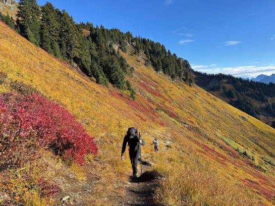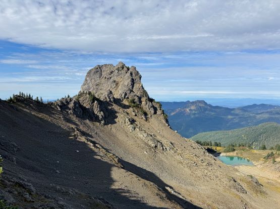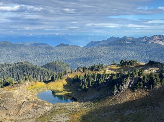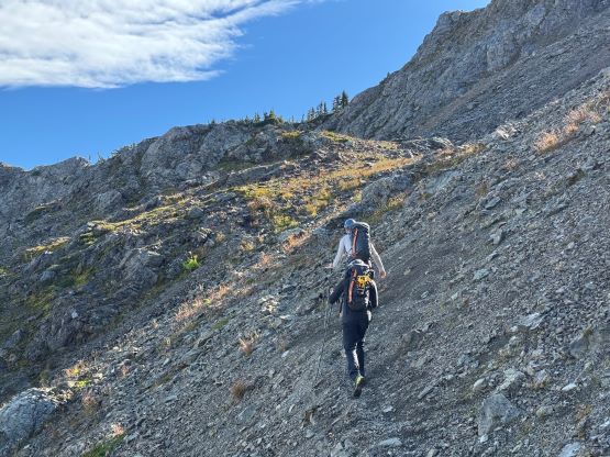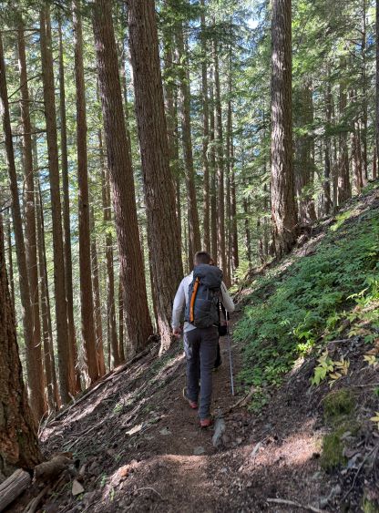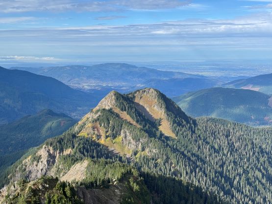 We lingered up there for more than half an hour to fully soak in the views but eventually it was the time to descend. I thought about taking the false summit variation but given the greasy conditions it was smarter to tackle the devil that we knew, so down the north side ledge we went. A few delicate moves later we were back on the sunny south side of the face and had a quick descent back to that aforementioned saddle. I picked up the ditched shoes and decided to swap them on later, after finishing all of the chossy terrain. This time we opted to take the “low route” variation traversing across the entire north face of that old fire lookout without grunting back onto its summit, and then took a short-cut down some steep heather to rejoin the trail. The rest of the descent was uneventful and we finished the round trip in just over 5.5 hours. While driving north across the border I did some math. I would be home no later than 4 pm, but I had no work booked in the evening. Instead of wasting an entire evening at home I made the spontaneous decision to do a bonus trash bag. Mission was only half an hour away and there’s indefinitely amount of dumpster supplies. I tend to go for the worst when I go out alone, so I picked “Weatherhead Peak”.