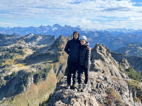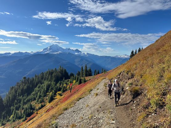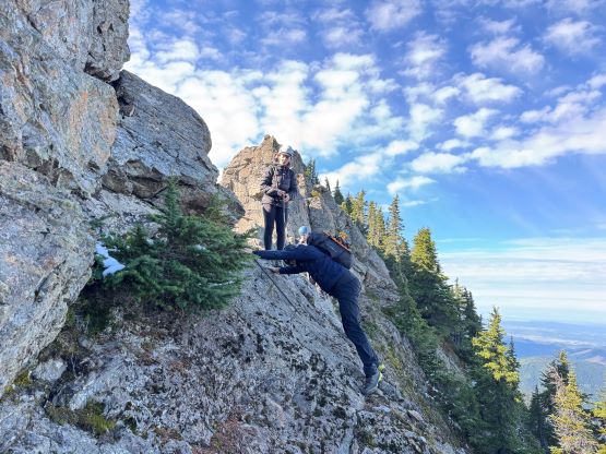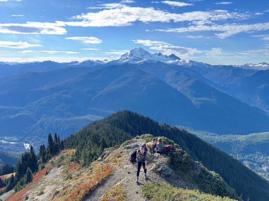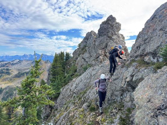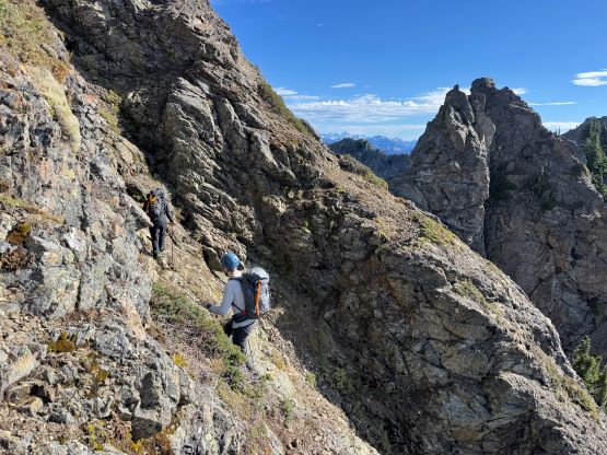 We shouldered the heavy ass packs and started the approach. The Washingtonians do maintain their trails at an unbelivable standard that even this mediocre destination has a trail with quality no worse than the Garibaldi Lake’s. I did think there were too many switchbacks and I would prefer the trail to be shorter but steeper, but in any case it didn’t take us long to reach the meadows at 1500 m elevation. We took a break donning sun protection and then took our time grunting upwards to the old fire lookout. For the last 20 m elevation gain we took the decommissioned “cable route” that involved some scrambling. Most of the hikers would stop at this point but that’s considered unacceptable for us. In fact, a simple search in Washington’s Church Mountain results in more trip reports claiming “Church Mountain” by only reaching the old lookout site. What a shame. The warm temperatures had apparently done us a favour by melting most of the new snow, that the entire south face of the summit scramble appeared bone dry. We nevertheless decided to carry all of the gears to the top to complete this weight training program. To descend the north side of the old lookout side Andrea and I picked a direct but sketchy route whereas Francis and Alex went around to find a more suitable way. We then joined together and took the “high route” variation by staying mostly on the connecting ridge to the saddle where we could cut onto the south face of the summit block. The ridge was slow going but not difficult.