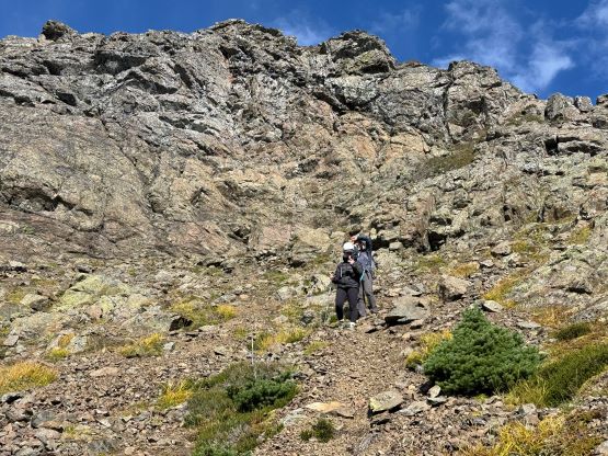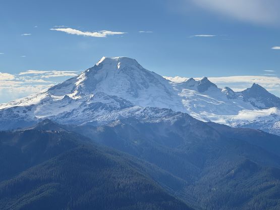 After traversing back into the sunshine we took another break mostly for me to swap footwear from the trail-runners to the Trango Tech mountaineering boots. I had opted to wear the Salomon runners on this outing and they weren’t nearly as good as the Arc’teryx approach shoes especially on wet and greasy terrain. We then traversed into and out of a couple gullies with one involving a few committing 3rd class moves, a long ways across the south face to that diagonal “ramp” trending NE. Ascending this ramp all the way to the east ridge, east of the false summit was the easiest part of the route but there were lots of loose pebbles on down-sloping terrain that warranted caution. I knew some parties took the route up and over the false summit but we opted for simplicity, traversing down onto the narrow path on the north side. There was unfortunately still some snow but not a lot. This entire traverse on the north side of the ridge was wet and greasy but no gear was needed. We had to thrash through some bushes, climb some steep heather and deal with at least one more exposed class 3 section but the true summit was quickly attained.