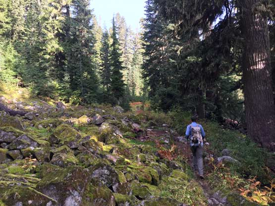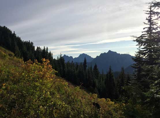 There were already a few vehicles parked at this remote spot including a horse trailer. After a quick canned food breakfast Adam set a blistering pace up the trail and we made to Damfino Lakes junction in no time. It’s been about 2 weeks since my last hike that I had to work really hard to keep up the pace. The trail was extremely wet and muddy from the recent rain events, but thankfully the trail was wide enough that wet brushes weren’t a concern. The views didn’t open up until a rising traverse across a grassy slope on the SE Face of Cowap Peak and shortly after that we arrived at the broad NE Ridge’s shoulder. There wasn’t a trail marked on any map beyond this point, but Adam had done his homework saying there’s an unofficial trail on the ridge running all the way to the summit. I wasn’t fully convinced but the trail was pretty damn obvious.