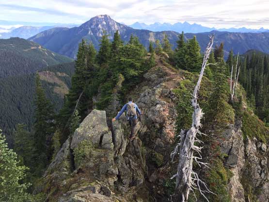 Me negotiating the narrow spot along the summit ridge. Photo by Adam W.