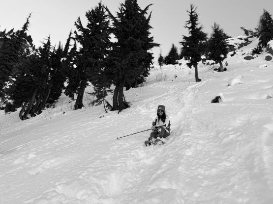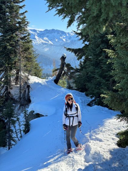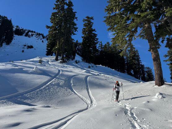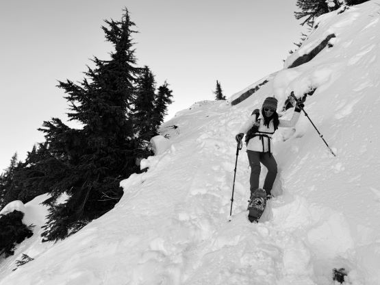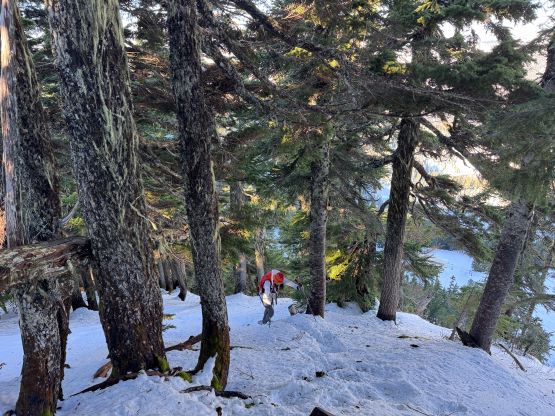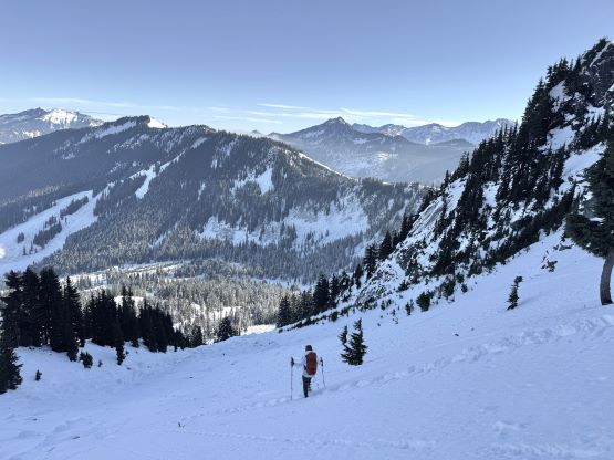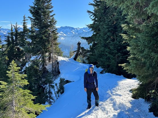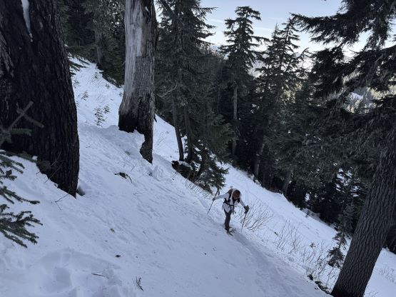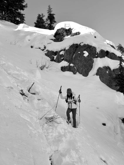 The true summit itself was quite forested but there were several better viewpoints in the immediate vicinity. After taking in enough of the views we had to head homewards. I made the spontaneous decision to descend the steep north face after seeing a viable route, mostly for fun. Kate also needed more practice on her “technical snowshoeing” thing. The terrain was over 40 degrees at the top but quickly became more manageable and we both successfully descended the entire face without taking the snowshoes off. The condition was deep and powdery and there were plenty of skiers tracks around. Lower down we entered some poorly covered boulder fields and found several deep holes. The rest of the descent was uneventful by taking the most direct way back. We did not join the other route until basically back to the trail-head so this was a complete loop. Our round trip time was 2 hours 40 minutes and we took turn driving back to White Rock by 2 pm. I earned myself about an hour of napping time and then worked all the way to midnight.