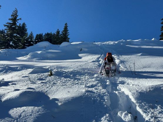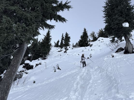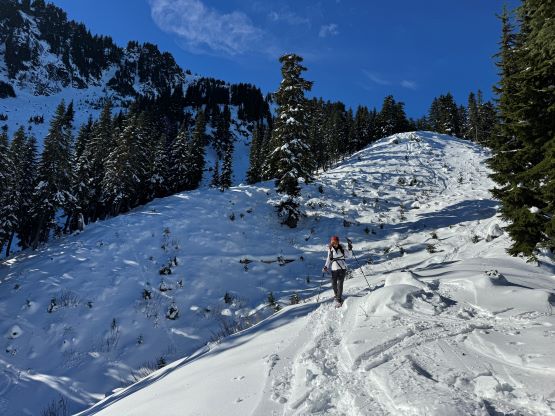 There’s no point in doing an alpine start for such objective so we leisurely woke up at 7 am in the morning in the back of the Subaru. There were already several vehicles pulled in by then. About an hour later we started and the weather was indeed gorgeous. There was enough snow to strap the snowshoes on not far from the parking lot. My planned route was the west ridge by taking the service road for as far as possible. The entire road had been tracked out by the snow machines so the post-holing was non-existing. We still needed the snowshoes for the added traction. The section to gain the actual west ridge was insanely steep but thankfully a previous group of snowshoers had already plowed through a trench for us. The trail-breaking duty would be heavy otherwise. The true summit was still a ways away but the going was decently straightforward by simply following the existing set of tracks.