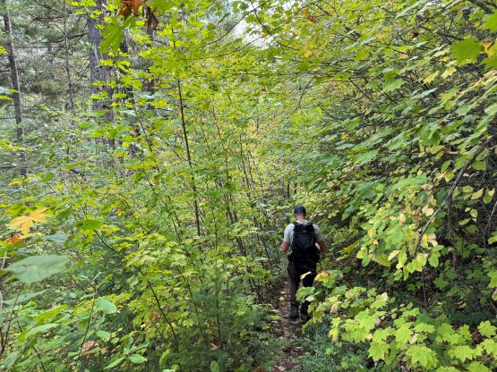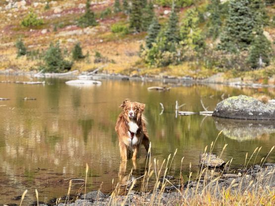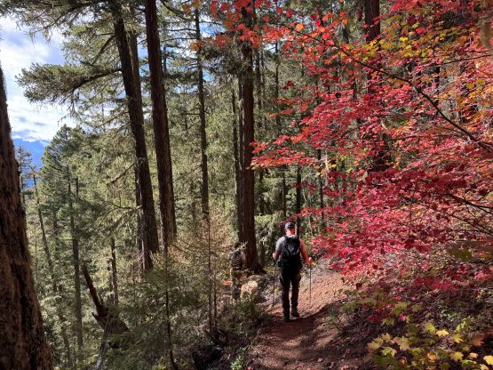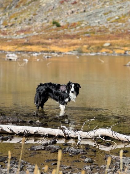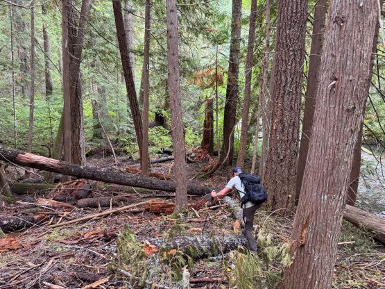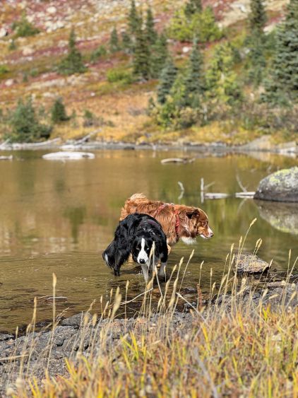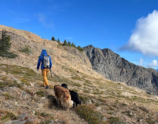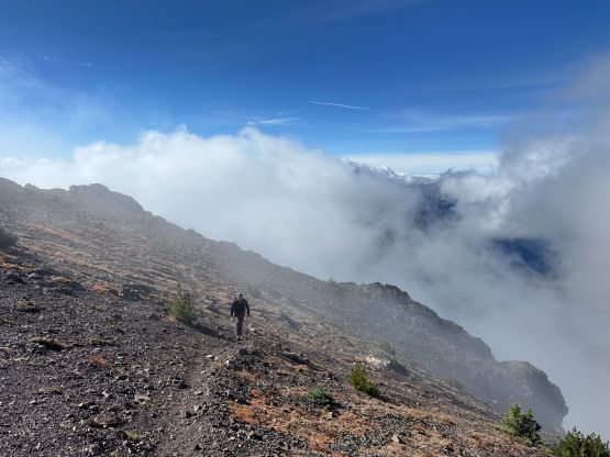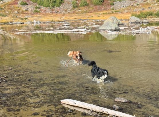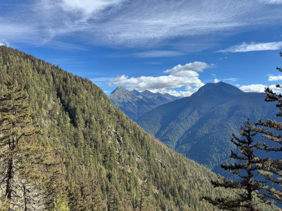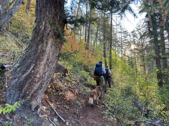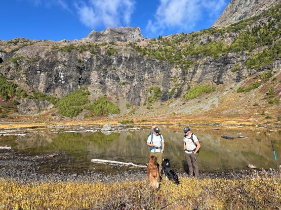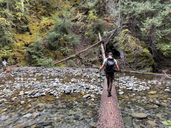 Mark had apparently done his homework and was aware of the downed bridge across Canyon Creek. This is apparently a “ford” mentioned in some older trip reports, but these days there’s a log for hikers to cross, about 50 m upstream from the old crossing point. Accessing this log proved to be rather tricky as there’s no direct way of getting their without wetting our feet. Instead, we opted for an up-and-over scrambling option by detouring on climber’s right. We did some hands-on scrambling on choss to get back down to the river bed. I’m not entirely sure if we had picked the easiest way but it worked for us, so I wouldn’t bother to dig. The reference GPX track did not detour as much as we did so maybe there’s a better solution, or maybe that person opted for fording. The trail on the other side of Canyon Creek was a bit overgrown but it wasn’t bushy enough to bother us. Nico and Mark took turn setting the blistering pace and I had to work quite hard to keep up with the pace. I called for a break to don some sun protection as my neck was feeling the burn in the south-facing forest, but otherwise we did the push to the tarn unofficially known as “Crater Lake” in a single push. Mark and Nico’s dogs needed to stay hydrated so we took a long break at the lake.