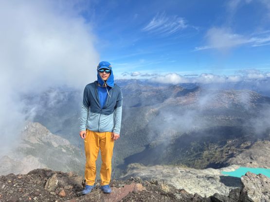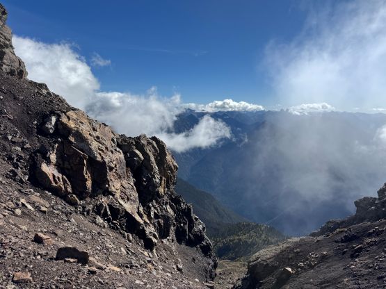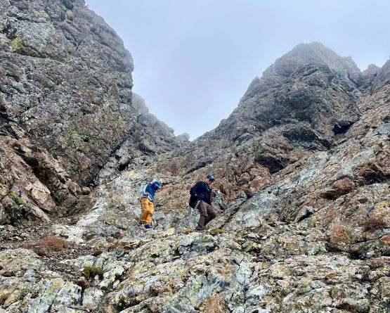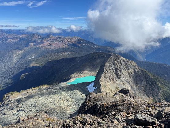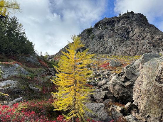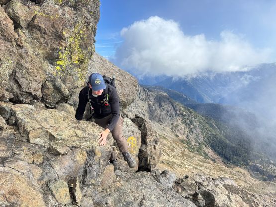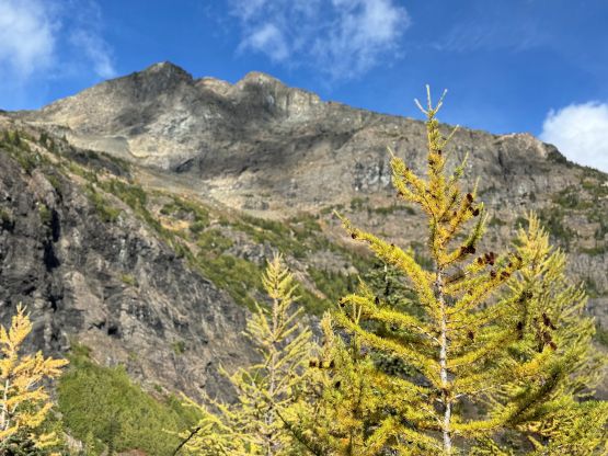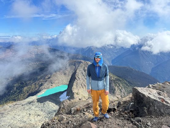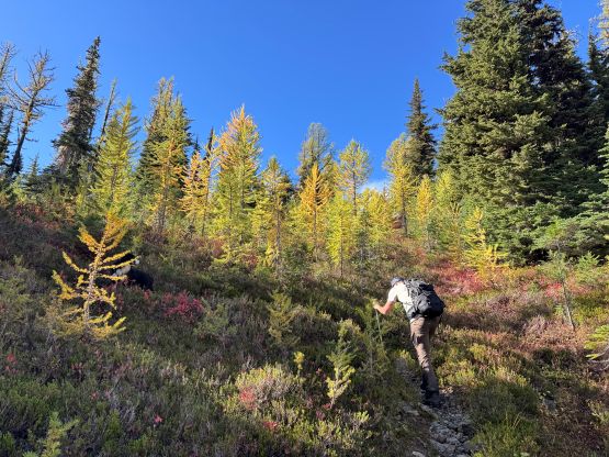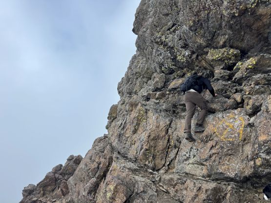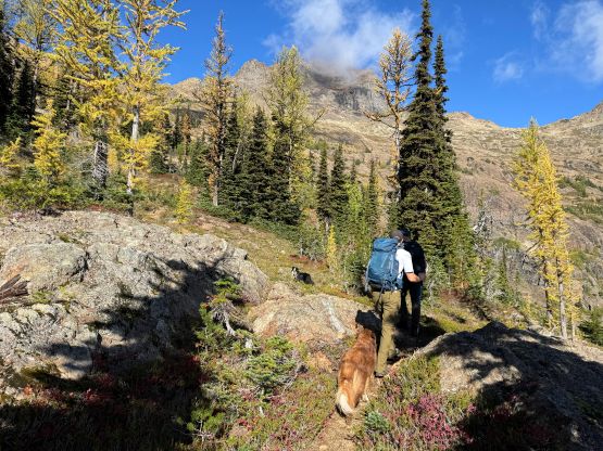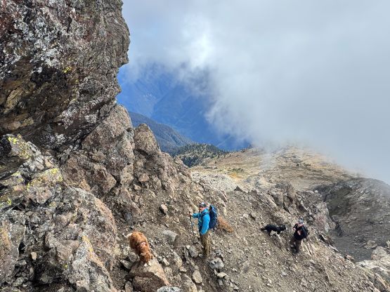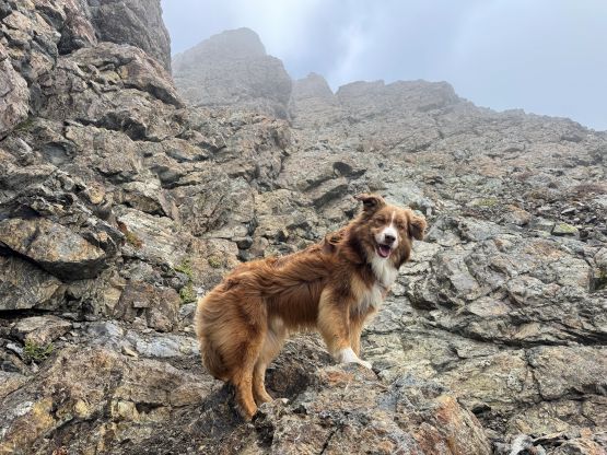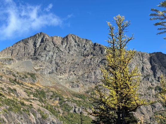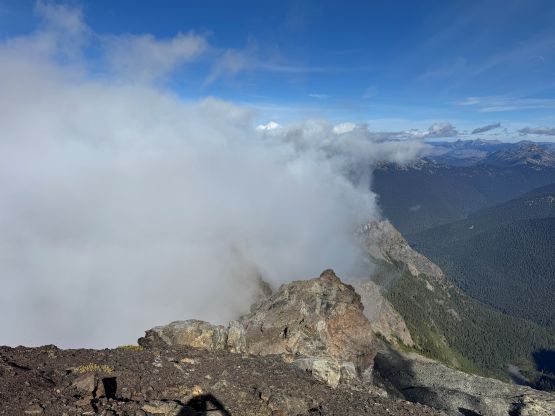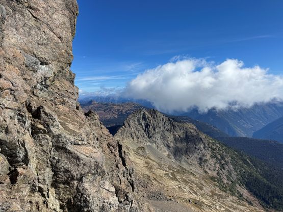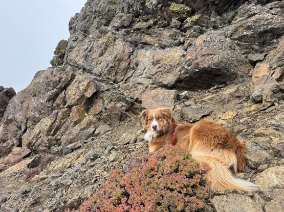 The section above the lake had some unexpected larches and the larches were about to hit the peak colours. I wasn’t anticipating a “larch madness hike” on Crater Mountain so this was a pleasant surprise. We however did not take our time photographing the larches as we were rather pressed with time. The ascent was foreshortened and took a while. The climber’s trail was quite easy to follow even though it was fairly overgrown. It brought us onto the “SW shoulder” with some open views down into the valley. We then followed the path onto the south ridge and then into the alpine. We were greeted by some bitterly cold winds and fog so the scramble was mostly done with minimal visibility. I also did not bring my gloves but it wasn’t that cold yet. The worst was the 3rd class gully section as the terrain was too loose for three men plus two dogs. The dogs were struggling to ascend the initial 4th class step out of the gully even though the exposure was minimal, so Nico volunteered to stay behind watching the dogs. Mark and I continued up the ridge. I thought the scrambling was mostly only 3rd class with maybe a few or two steps that could possibly be rated “4th class”. We also broke through the fog layer and got some nice views from the summit.