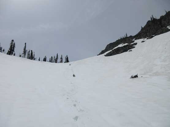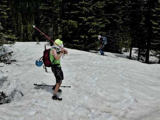 After making ascents of The Castle, Pinnacle Peak and then Plummer Peak Lily, Alan and I were still looking for more to do. The plan was to head over and grab Denman Peak and Lane Peak. The detour to Denman Peak seemed to require minimal effort but I wasn’t very positive about the other peak, but we would see once we got there. Plunging and boot-skiing down from Plummer Peak was super enjoyable on the (still firm) snow. Then up the SE Ridge of Denman Peak we found mostly dry ground. Nothing’s worth noting except for the summit was actually partially wooded obscuring the panoramic view. At the summit we decided against pushing any farther.