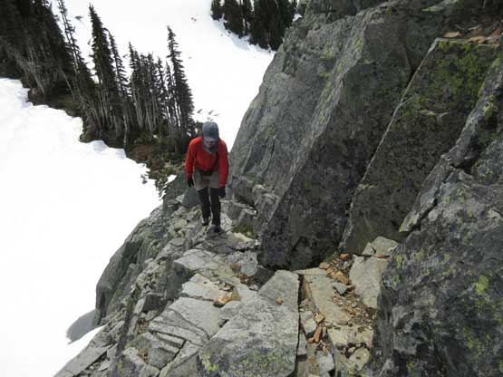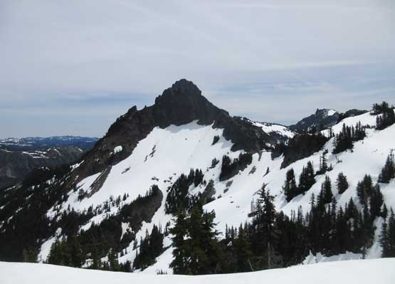 Denman Peak is a mere bump in the already-insignificant Tatoosh Range and is a perfect example of why-bother… The only reason I considered making this ascent was to combine with the nearby peaks to make a loop traverse. The ascent does have a few fun scrambling moves following the ridge from Denman/Plummer saddle, and the ascent is better done in spring when snow covers much of the underbrush. Unlike its popular neighbours there’s no trail heading up Denman Peak hence some degree of bushwhacking is required.