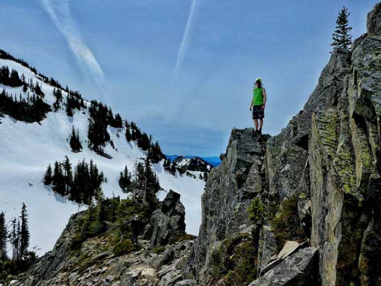Denman Peak is a mere bump in the already-insignificant Tatoosh Range and is a perfect example of why-bother… The only reason I considered making this ascent was to combine with the nearby peaks to make a loop traverse. The ascent does have a few fun scrambling moves following the ridge from Denman/Plummer saddle, and the ascent is better done in spring when snow covers much of the underbrush. Unlike its popular neighbours there’s no trail heading up Denman Peak hence some degree of bushwhacking is required.