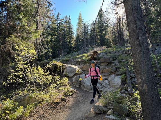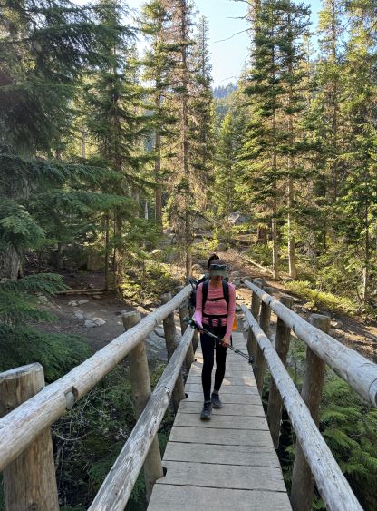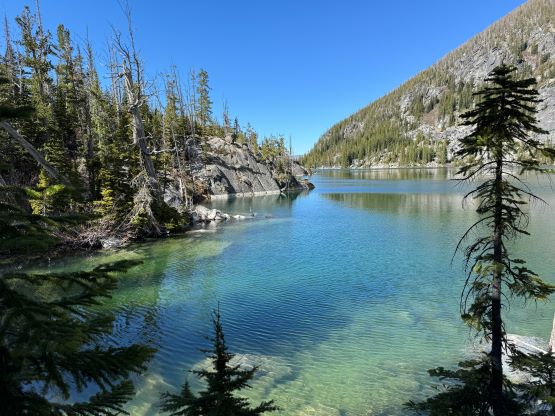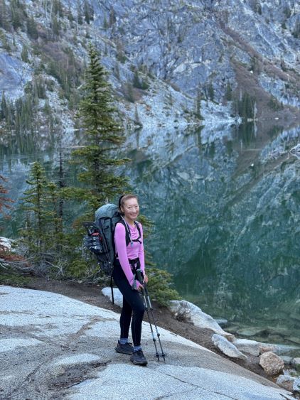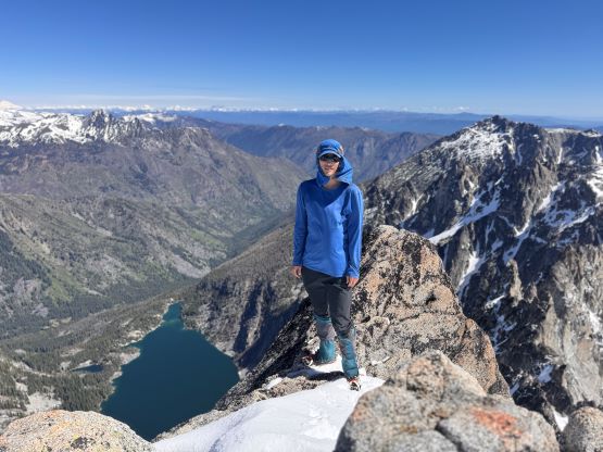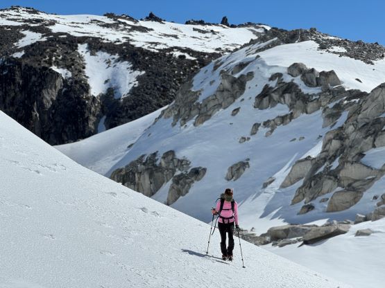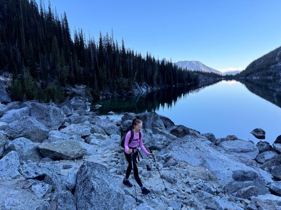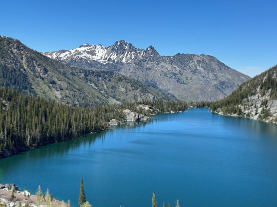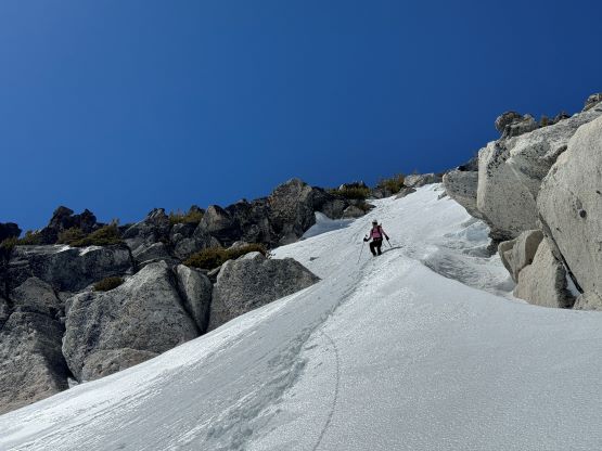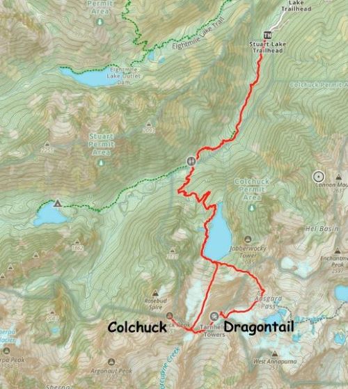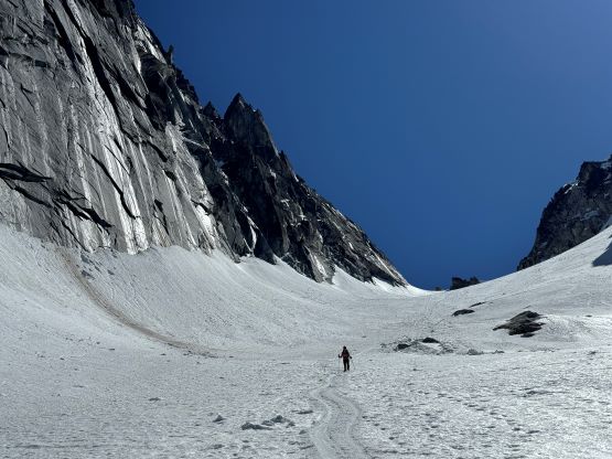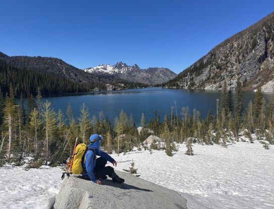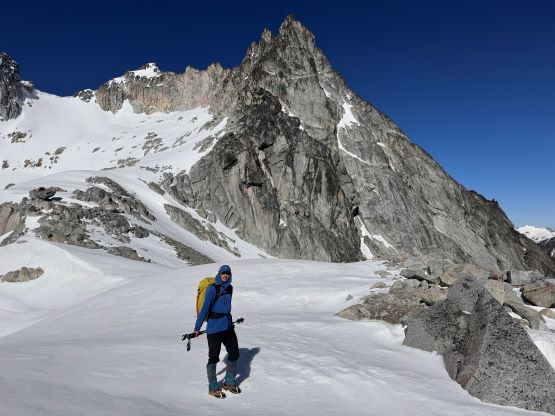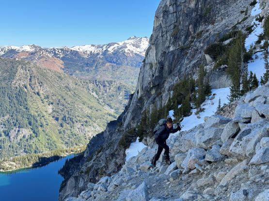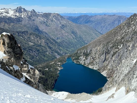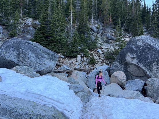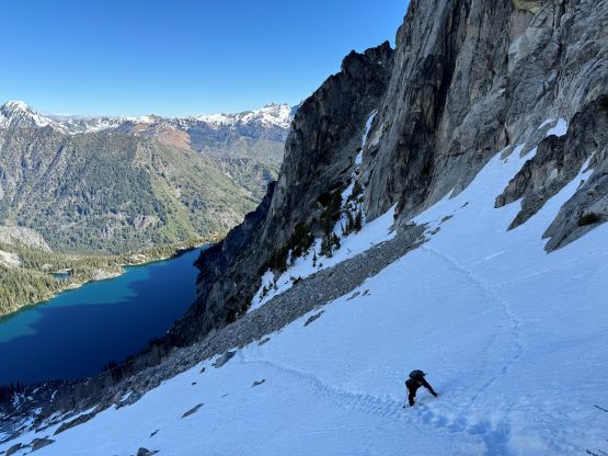 After another lengthy summit stay we finally decided to go down, and then we observed three climbers on their way up one of the north side routes. They were about 2 pitches from topping out so they would have even softer snow conditions on the descent. In any case I didn’t even need to use crampons and just slipped and postholed back to Colchuck/Dragontail col. The descent off Colchuck Glacier involved a mix of glissading, boot-skiing and plunging and was extremely fun thank to the soft snow. I was looking forward to this part of the trip and that’s also one reason why we decided to do the loop in the clockwise direction. We made a single dash down to near the shore of Colchuck Lake, took another break and then picked up the ditched trail runners. Traversing back around the south shore was now very tedious thank to the unexpected (or expected) postholes in the boulder fields, so we took our time there. The waterlogged boots were then swapped for the dry runners but I had forgotten to bring a pair of spare socks. Thankfully Erica offered a pair of hers so I was able to do the rest of the hike-out in dry feet. The plodding back to the trail-head was long and tiring but was actually not that bad.