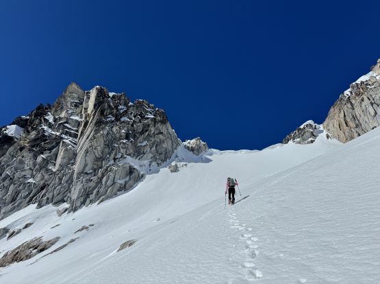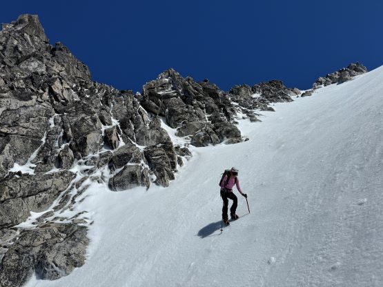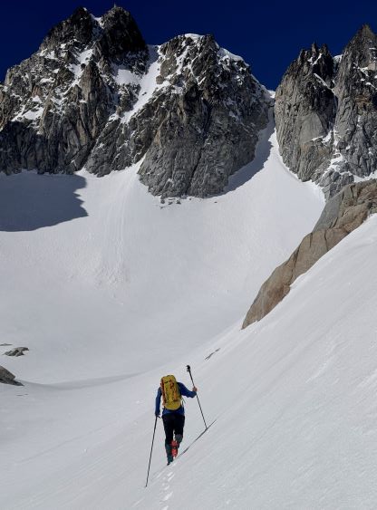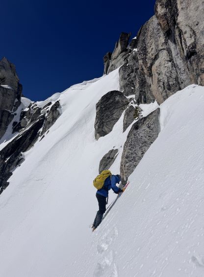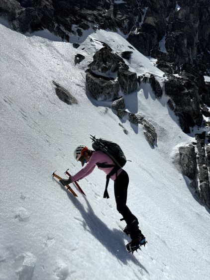 It seemed to me that no matter how fast I pushed on the approach hike Erica was always right on my heels so we dashed up that boring trail rather quickly, arriving at Colchuck Lake in about an hour and half. I probably could have done it slower so we didn’t have to sweat that much. After seeing the peaks in our own eyes we decided to ditch the snowshoes but if the tourists saw my 400-dollar brand new Lighting Ascents they would take them, so we did a bit of bushwhacking so hide them behind a creek and a rather large boulder. The approach around the lake had a lot of undulating terrain but I knew that based on the previous experience, and the boulder field on the south side of the lake was only partially covered in snow. The snow was icy in the morning, so the going was straightforward but eventually we stopped for the second batch of gears dump – ditching the trail-runners and donning mountaineering boots. I wasn’t too sure about the availability of water sources up high so we loaded up our water carrying capacity at the bottom of the foreshortened slog up towards Aasgard Pass, and sure enough 15 minutes later half of Erica’s water leaked. It did not seem feasible to patch her bladder so we would only have a liter and half of water between the two of us, which was questionable but probably doable. While slogging up towards the pass we both donned our brand new Vasak crampons and I was generally satisfied about the performance. The crampons were worn all the way up to the pass, and to my relief we found a running source of water and took another long break there in the sun.