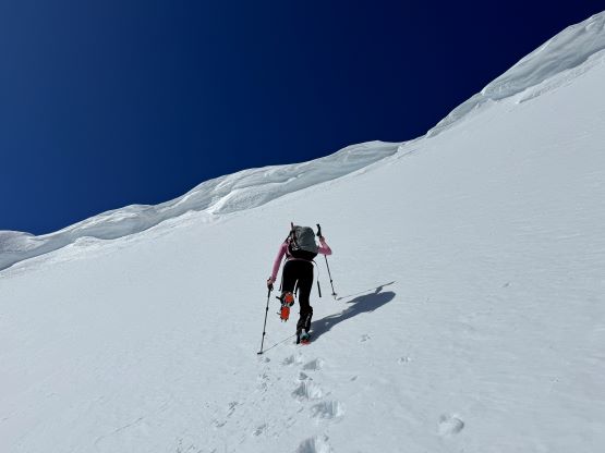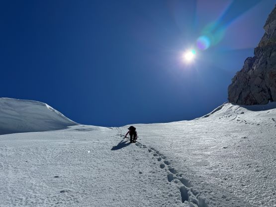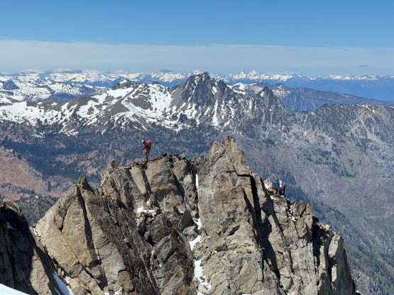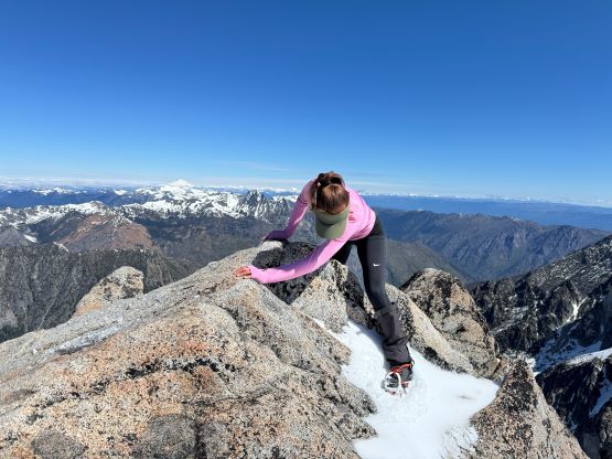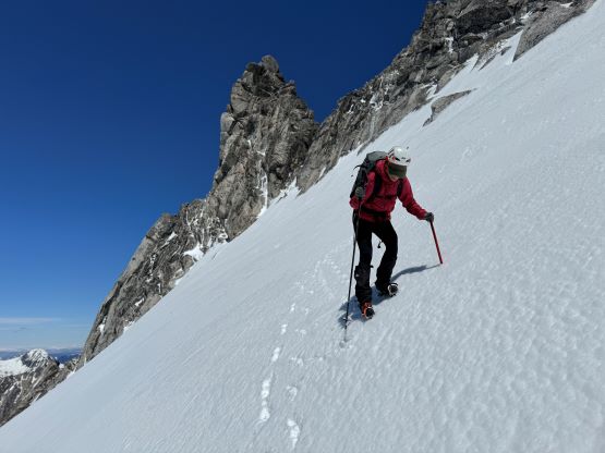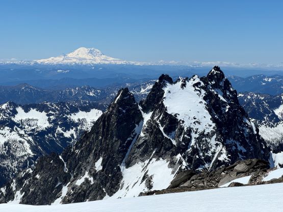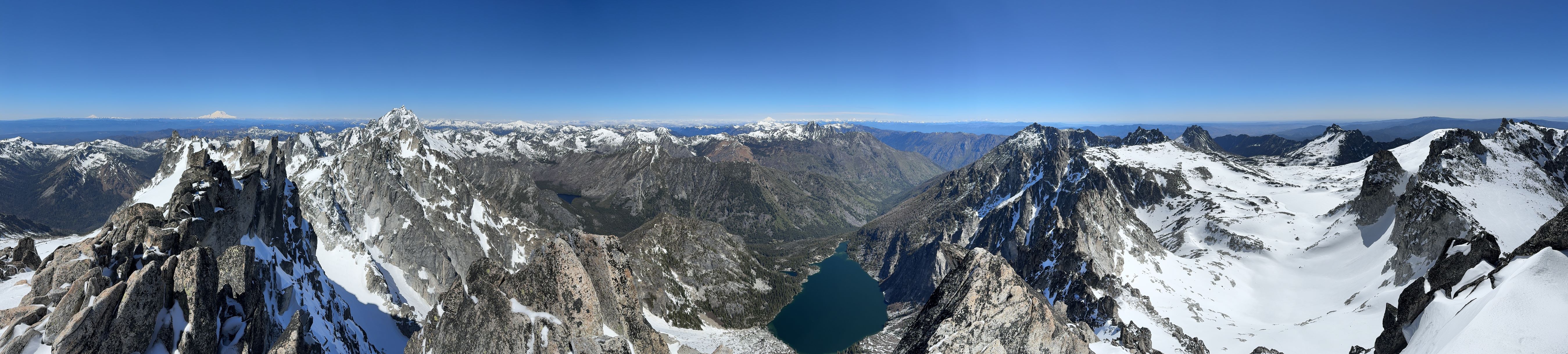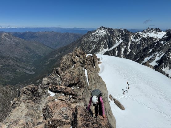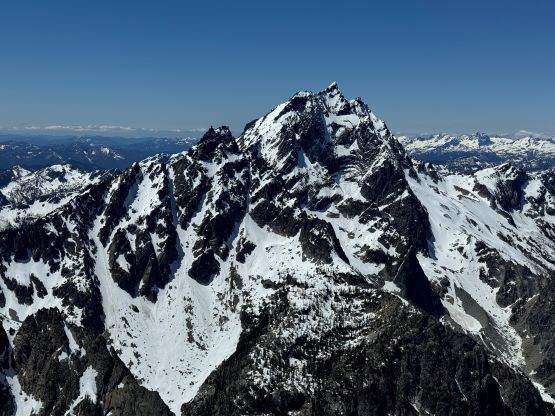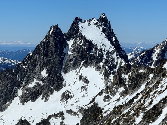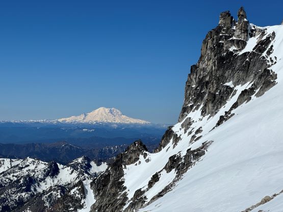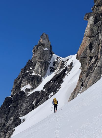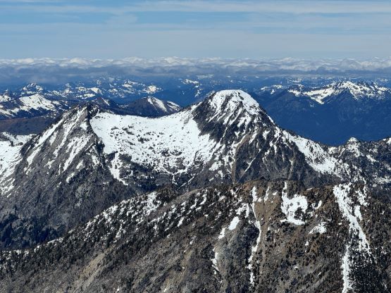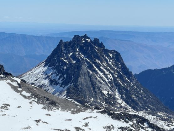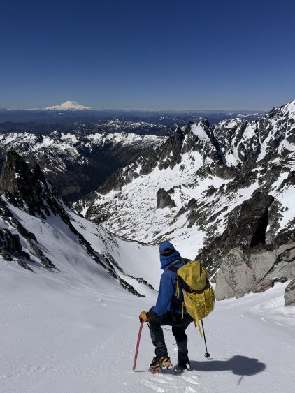 There was again, no visible track on Colchuck Peak so we made our own postholes up the lower SE Face. This section was steeper than I thought but the snow was already very soft making some easy climbing conditions. I did use an ice axe on the ascent but stored both the axe and crampons later on the way down. There were at least two steep 40-degree constraints to take note of but maybe that’s because we didn’t spend enough time to find the “easiest possible way”. The upper route was fairly flat with views of Argonaut Peak stealing the show to the south, and to reach the highest point we had to make a few scrambling moves with crampons on.