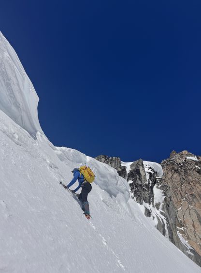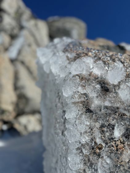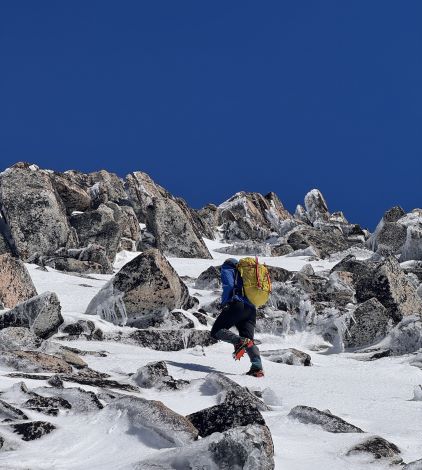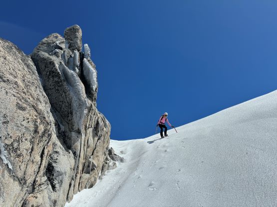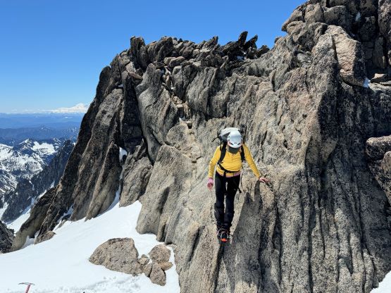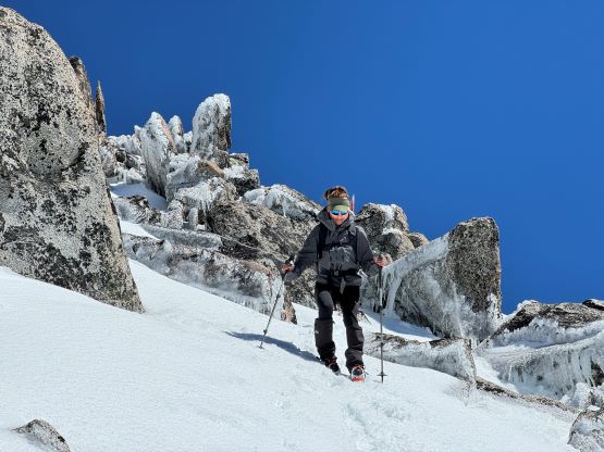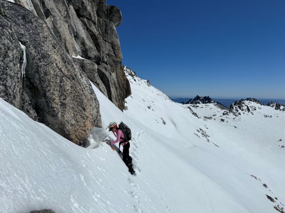 There was another steep rise to actually top out at Aasgard Pass and then it’s time to tackle our first objective. There was not obvious foot prints heading up the standard route of Dragontail Peak which was to our surprise, so we mostly picked our own way. I thought the route-finding must be straightforward and did not even bother to download a GPX track. Instead of following the dotted lines on the Gaia map which is the summer route I led us traversing to that pocket east side glacier. The condition softened up quickly but not to the point to raise any safety concern. Erica then took over the lead breaking trail all the way to that steep pitch under Dragontail Peak’s SE Ridge. I was struggling to keep up from behind as I made additional post-holing on top of Erica’s track from time to time. That steep pitch was indeed very steep and involved a “snow mantle” on 55+ degrees terrain but only for a meter or two. Both of us did not even bother to take the ice axe out and just used our fingers for added traction. The rest of the ascent via the standard route was straightforward with lots of cool verglass scenery thank to the recent precipitation. I was glad that we didn’t have to do much scrambling on rock as that would otherwise not be very feasible.