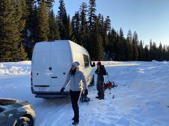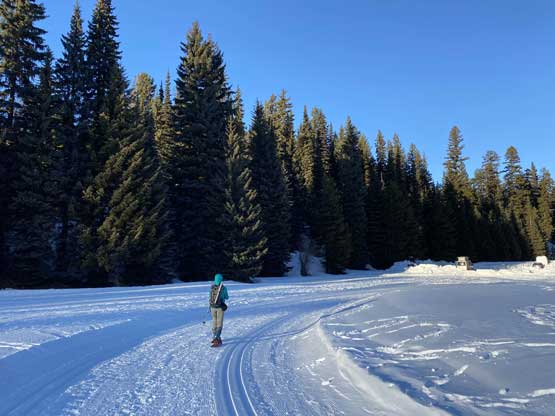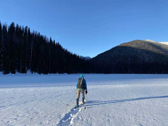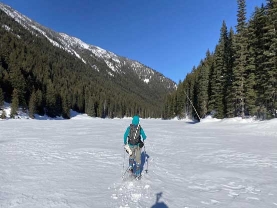 Again, without doing any lingering we soon started the descent. We followed the now-trodden tracks down and across the sketchy zones in no time and then easily plunged on untracked powder into the forest. When snowshoeing downhill on soft snow I prefer to not use the existing tracks for more gliding and fun. About half way down the wooded NE Ridge of Scimitar Knoll we past Karen and Michelle descending. After some quick chatting we resumed our furious and fun plunge. It’s not usual to have cold, powder snow persisted into mid-March and we wanted to make the most use of it by plunging really fast. I got stabbed on my face one time by bush. I saw it but couldn’t react fast enough as I was getting pretty beaten up by this point. Down to Strike Lake, Mel took over the lead breaking trail as the lake was windy enough that the fresh tracks were all covered. For the next hour or so we plodded as fast as we could while retracing the exact tracks we took, including that stretch of off-trail wondering. We got back to the trail-head just when the last rays of sun beam dipped down behind the hills.