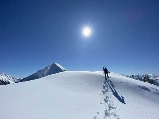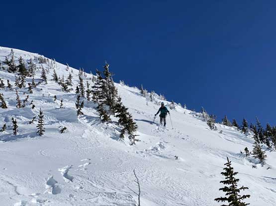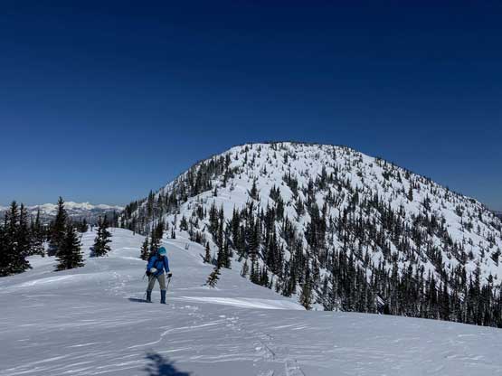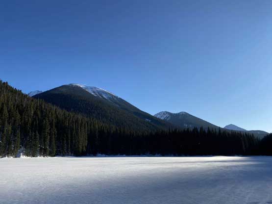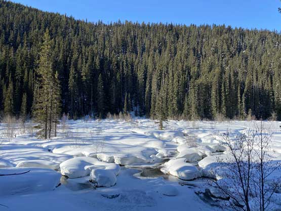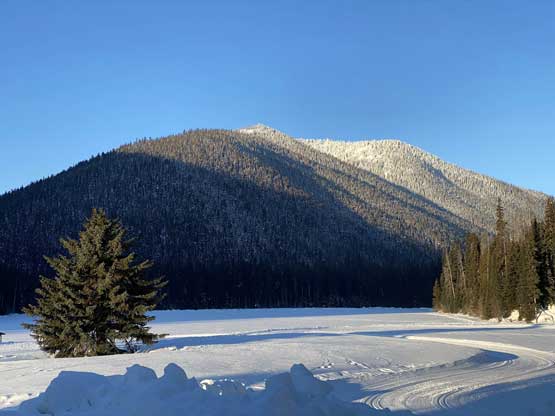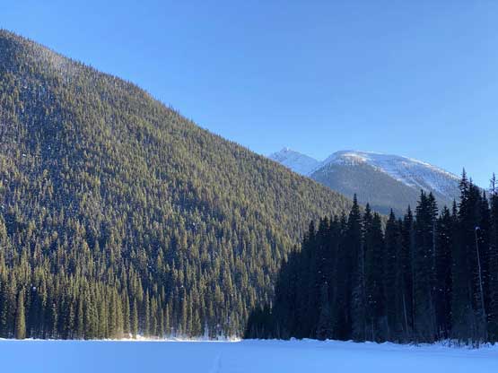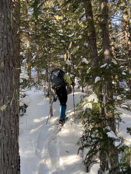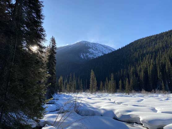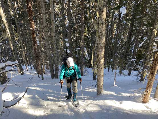 The temperature dipped down to -21 degrees Celsius at Allison Pass but warmed up to -16 degrees at the trail-head when we saw the first sun beams of the day. The gearing up took a while so once we started the plod across Lighting Lake we went as fast as we could in order to stay warm. The plod across the entire length of Lighting Lake felt just as long as my last time doing it. Once we finally finished plodding across this lake we got off shore and found the well-trodden trail. There was minor up-and-downs along the trail but it seemed more efficient than breaking our own trail on the lakes so we stayed on the trail bypassing Flash Lake. The trodden track took a sharp turn south across the stream on the far side of Flash Lake leaving me wondering where the heck that went. Maybe there’s a campground but I had no idea. I made the call to bail into the forest to break our own trail and crossed the creek back to its north side after a couple hundred meters of trail-breaking and cross-country travel in the woods. We rejoined the trail but there was no longer any recent traffic activities so we had to pack down the path. A couple kilometers later we came down to the shore of Strike Lake and bailed onto the frozen lake. Mel then led the plod across Strike Lake to the start of Scimitar Knoll’s wooded NE Ridge, exactly 1 hour 40 minutes since we left the vehicles.