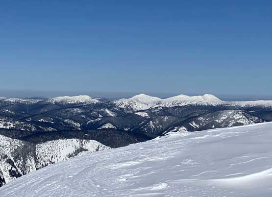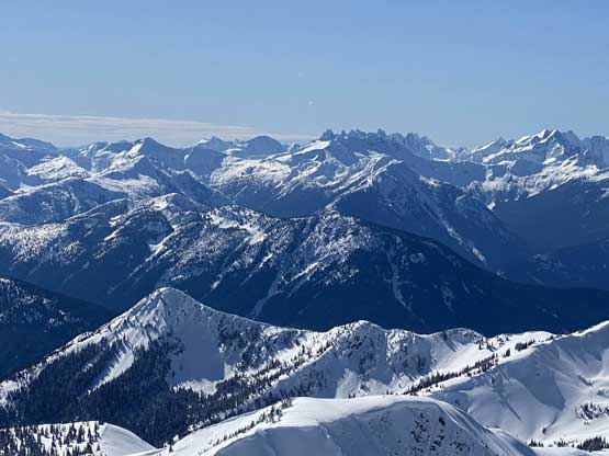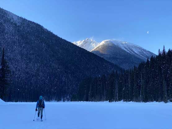 “Full Moon Rising” is the unofficial name of the substantial summit about 3 km west of Castle Peak immediately south of Monument 76 on the US/Canada border. The name was given by the Washington legend John Roper. The Canadian website bivouac.com named it “Fullmoon Peak”. I haven’t dug into the name’s history but from Frosty Mountain to the north, this peak does appear like a full moon rising out of the horizon. This peak isn’t unheard and in fact, I had been considering this ascent for quite a few years, but it had never gained serious interest given its proximity to the much-bigger Castle Peak as well as the lengthy and rough approach. The only approach that “makes sense” is by traversing up and over “Scimitar Knoll”, from Lightning Lake trail-head in Manning Park of British Columbia. There were a few trip reports on the internet and all of which were done in “late spring”, summer or “early fall” time. My plan was however, to do it on snowshoes as I saw no reason why this couldn’t be done in winter. A few years ago I snowshoed the west ridge of Frosty Mountain and I expected similar terrain but a much longer outing.