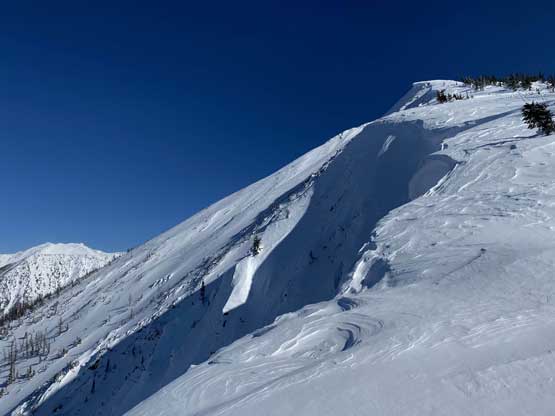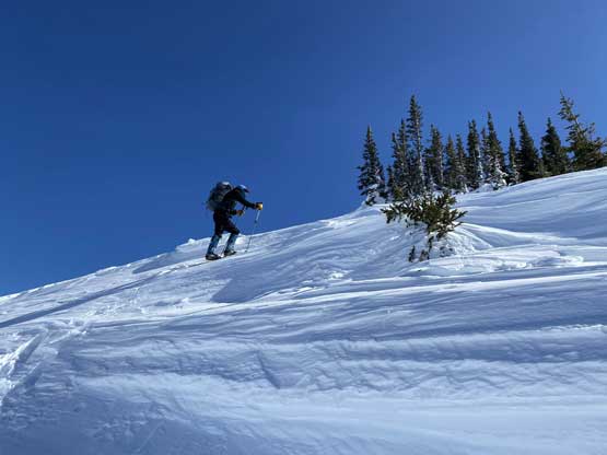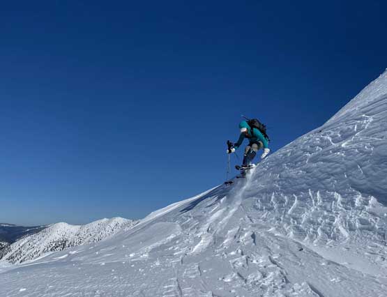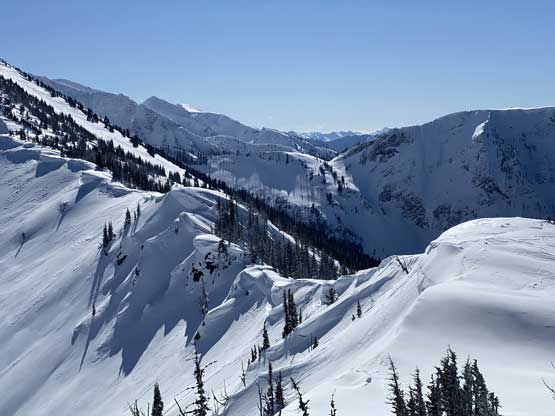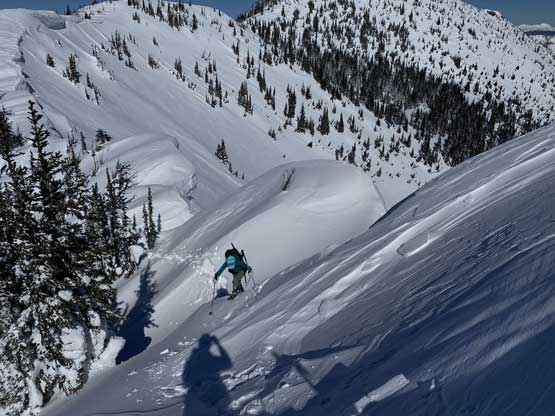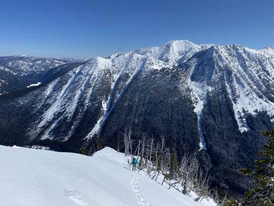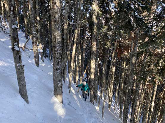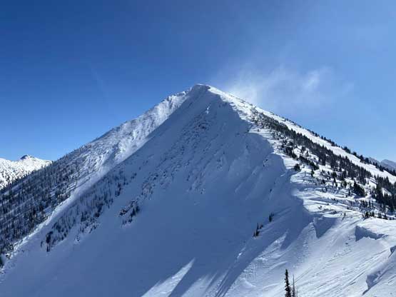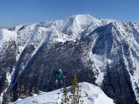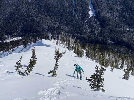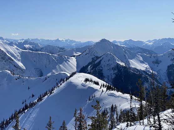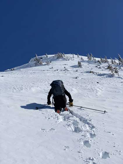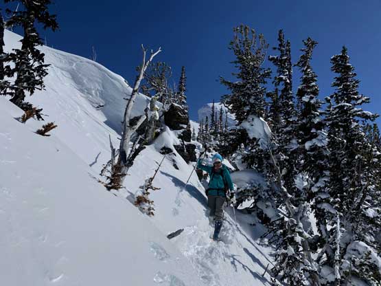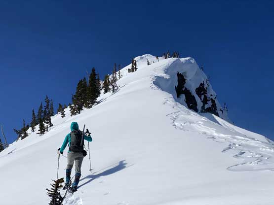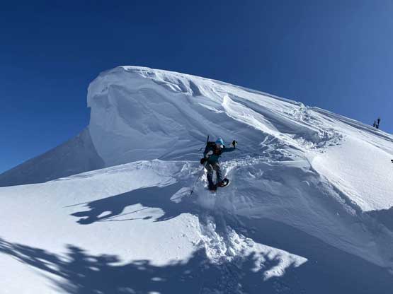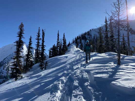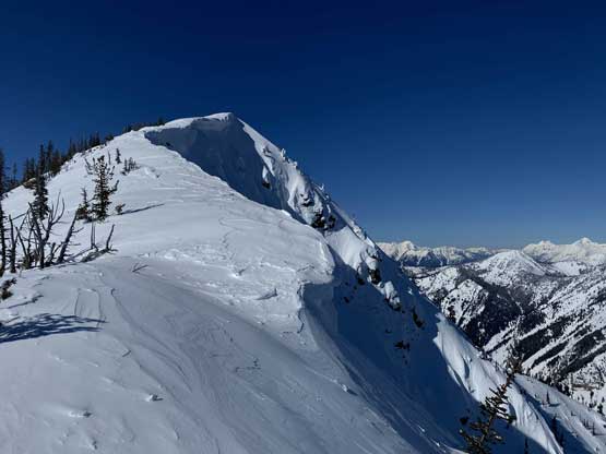 Without doing any unnecessary lingering Mel and I immediately turned our attention to Full Moon Rising. We didn’t even bother to take off our backpacks and instead, easily descended the SW Ridge of Scimitar Knoll and then went up and over several bumps towards the low point at Monument 76. One particular step on the connecting ridge looked very sketchy with cornices but turned out to be not a big deal. The lower section of the NW Ridge of Full Moon Ridge had a few steep, but not exposed rolls that required some “technical snowshoeing”. I thought about to ditch the snowshoes but the snow elsewhere was soft and deep, especially around trees. We kept snowshoes for halfway up the ridge and ditched them to swap for crampons. On hindsight we should have at least carried the snowshoes further as deep post-holing punished us higher up. The snow was indeed icy on the upper ridge but not everywhere. We encountered lots of weak spots and deep patches. The wallowing was painfully slow at times.