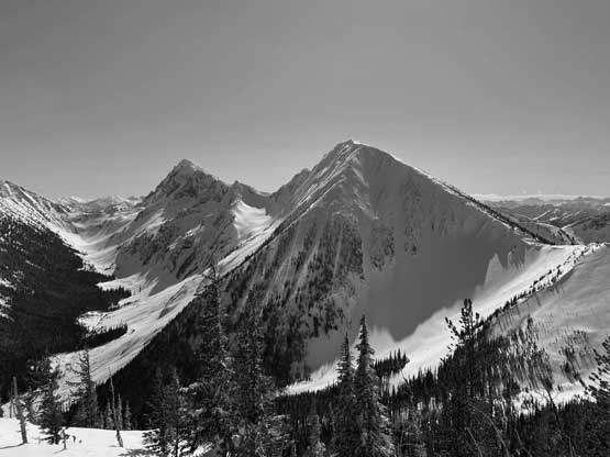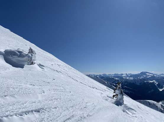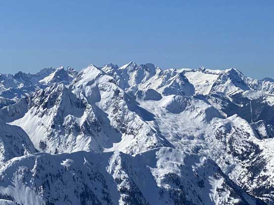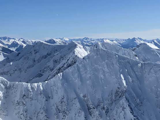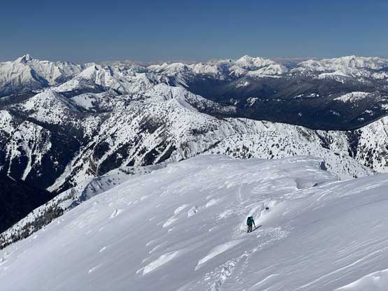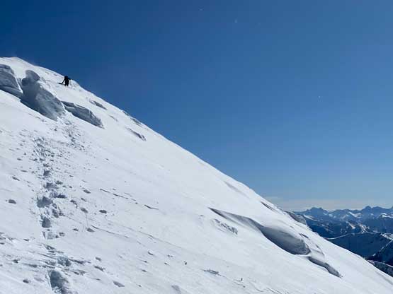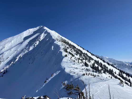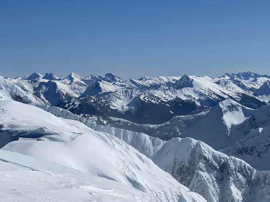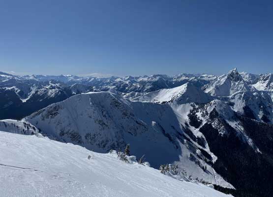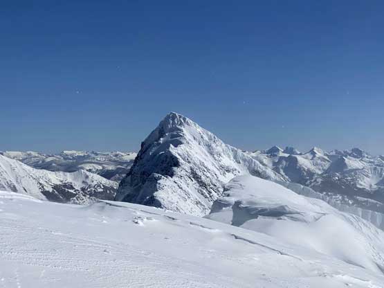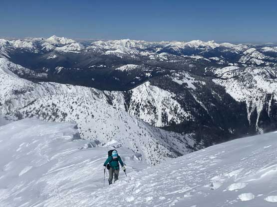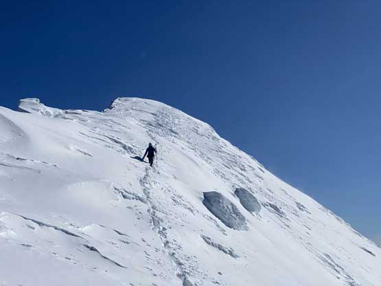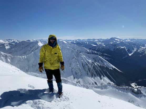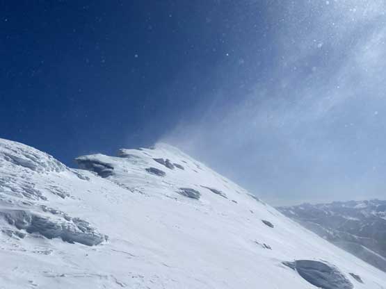The ascent onto the false summit had taken longer than I thought but the worst part was yet to come. The traverse to the true summit wouldn’t be bad at all in dry conditions, but we had to pick a line in between “too close to the cornices” and “too steep on the south slopes with huge run-outs”. The cornices were very scary and I knew the north face would be a straight drop to the valley, so I stayed very far from the edge. The punishment was patches of thigh-deep wallowing on the steep south-facing slopes. The summit itself was also suspected to be on a large cornice so we didn’t get that fabulous 360-degree views, but at least we got to see the tip of Castle Peak poking above the horizon.