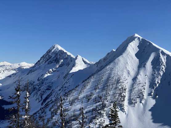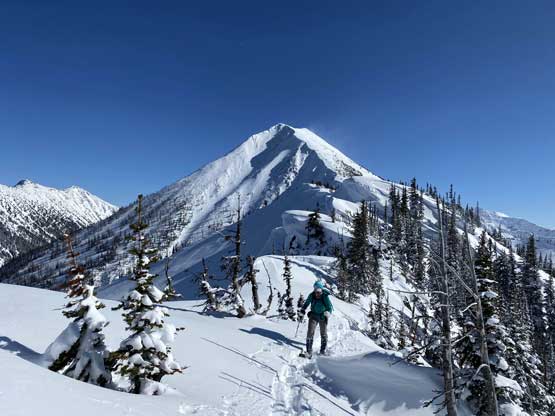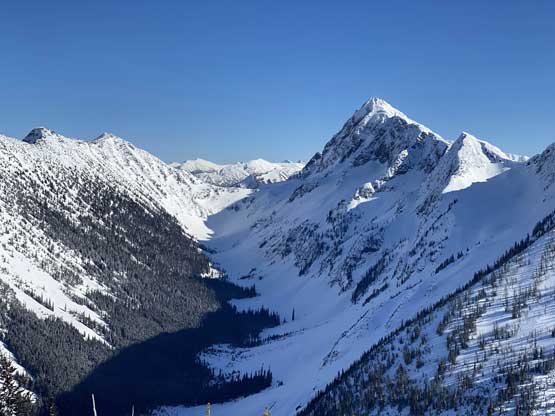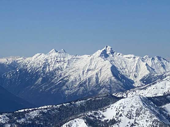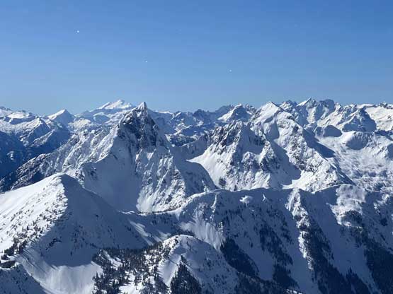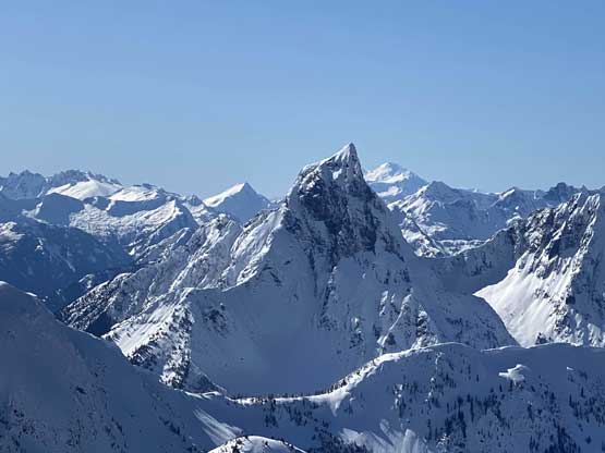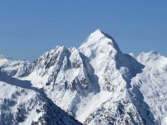 There was a steep section right off the bat but the steepness only lasted for about 100 vertical meters and then the ascent was fairly gradual with some minor rolling terrain. I actually had to check GPS multiple times to make sure we had our bearing correct. Another stretch of steep section game at about halfway up the ridge, and then the grade eased off again. Comparing to what we did on Mt. Coulter a couple weeks ago this was literally nothing. There was some trail-breaking effort but from the forest and bushwhacking perspective this was pretty tame by BC standard. There was a long stretch of flat or slightly uphill terrain before emerging into the treeline zone on Scimitar Knoll’s east ridge. There wasn’t much beta about this route in winter time and the appearance of Scimitar Knoll’s east ridge was much more daunting than I expected. About 100 vertical meters below the summit the ridge narrowed down with steep open slopes on the south side and massive cornices dangling over the north face. The terrain wouldn’t give me much of a problem on hindsight but before this trip I wasn’t expecting “mountaineering” at all to reach this first peak, so I was still surprised. I led some side-hill traversing lines on snowshoes staying well away from the cornices. There was a decent transition zone of “tree island” about 2/3 of the way across the sketchy zone, that I could stay on the ridge crest without worrying about the cornices. After that I went back to the side-hill traversing mode across the south side and soon we were on the summit of Scimitar Knoll with the sudden, jaw-dropping sight of Hozomeen Mountain.