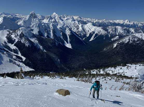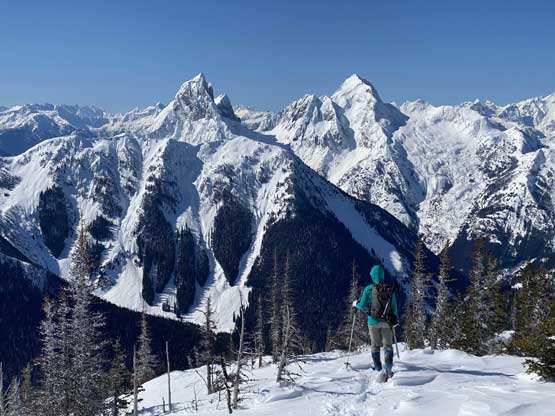 There was a steep section right off the bat but the steepness only lasted for about 100 vertical meters and then the ascent was fairly gradual with some minor rolling terrain. I actually had to check GPS multiple times to make sure we had our bearing correct. Another stretch of steep section game at about halfway up the ridge, and then the grade eased off again. Comparing to what we did on Mt. Coulter a couple weeks ago this was literally nothing. There was some trail-breaking effort but from the forest and bushwhacking perspective this was pretty tame by BC standard. There was a long stretch of flat or slightly uphill terrain before emerging into the treeline zone on Scimitar Knoll’s east ridge. There wasn’t much beta about this route in winter time and the appearance of Scimitar Knoll’s east ridge was much more daunting than I expected. About 100 vertical meters below the summit the ridge narrowed down with steep open slopes on the south side and massive cornices dangling over the north face. The terrain wouldn’t give me much of a problem on hindsight but before this trip I wasn’t expecting “mountaineering” at all to reach this first peak, so I was still surprised. I led some side-hill traversing lines on snowshoes staying well away from the cornices. There was a decent transition zone of “tree island” about 2/3 of the way across the sketchy zone, that I could stay on the ridge crest without worrying about the cornices. After that I went back to the side-hill traversing mode across the south side and soon we were on the summit of Scimitar Knoll with the sudden, jaw-dropping sight of Hozomeen Mountain.