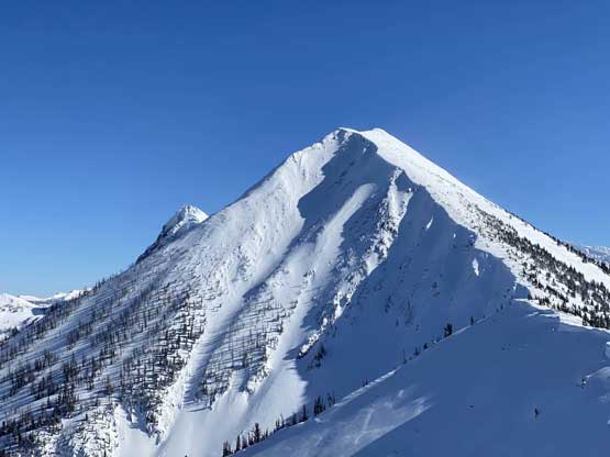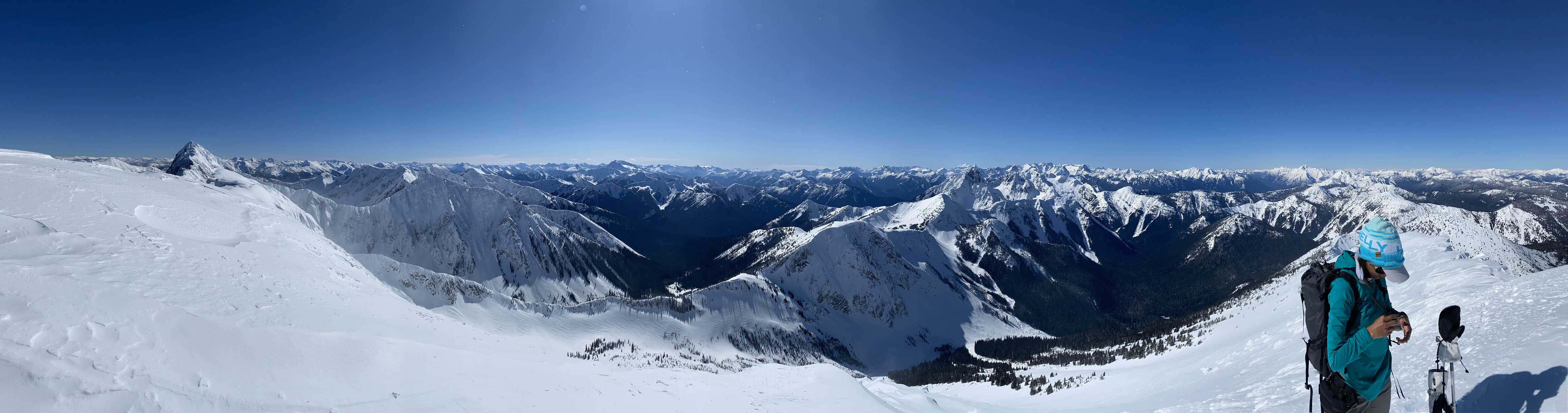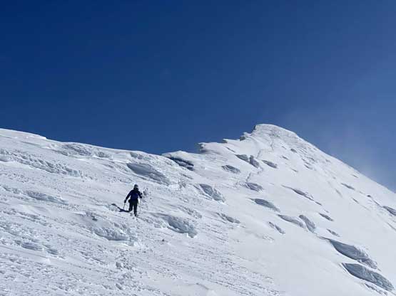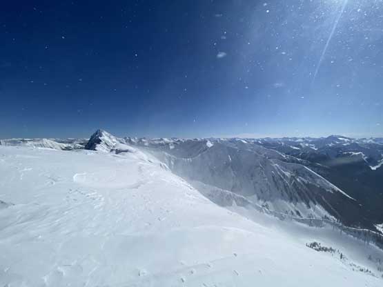 The ascent onto the false summit had taken longer than I thought but the worst part was yet to come. The traverse to the true summit wouldn’t be bad at all in dry conditions, but we had to pick a line in between “too close to the cornices” and “too steep on the south slopes with huge run-outs”. The cornices were very scary and I knew the north face would be a straight drop to the valley, so I stayed very far from the edge. The punishment was patches of thigh-deep wallowing on the steep south-facing slopes. The summit itself was also suspected to be on a large cornice so we didn’t get that fabulous 360-degree views, but at least we got to see the tip of Castle Peak poking above the horizon.