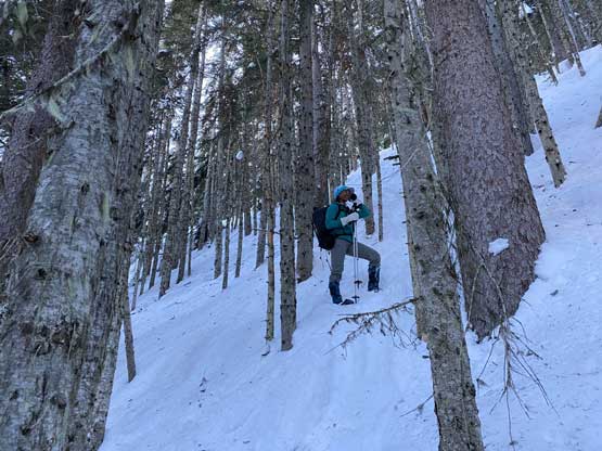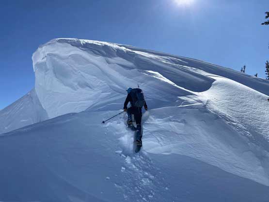 Without doing any unnecessary lingering Mel and I immediately turned our attention to Full Moon Rising. We didn’t even bother to take off our backpacks and instead, easily descended the SW Ridge of Scimitar Knoll and then went up and over several bumps towards the low point at Monument 76. One particular step on the connecting ridge looked very sketchy with cornices but turned out to be not a big deal. The lower section of the NW Ridge of Full Moon Ridge had a few steep, but not exposed rolls that required some “technical snowshoeing”. I thought about to ditch the snowshoes but the snow elsewhere was soft and deep, especially around trees. We kept snowshoes for halfway up the ridge and ditched them to swap for crampons. On hindsight we should have at least carried the snowshoes further as deep post-holing punished us higher up. The snow was indeed icy on the upper ridge but not everywhere. We encountered lots of weak spots and deep patches. The wallowing was painfully slow at times.