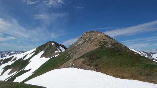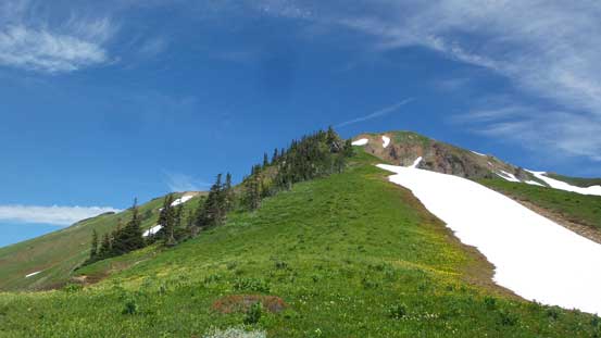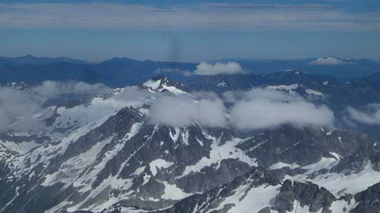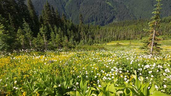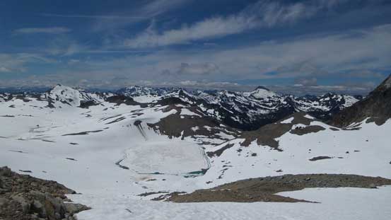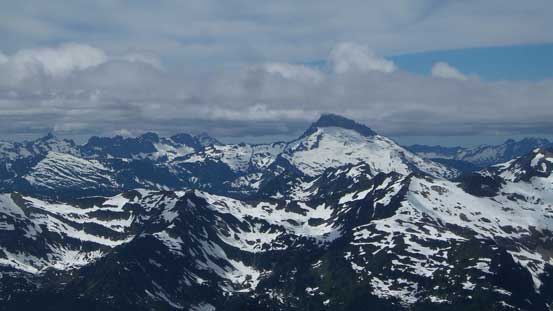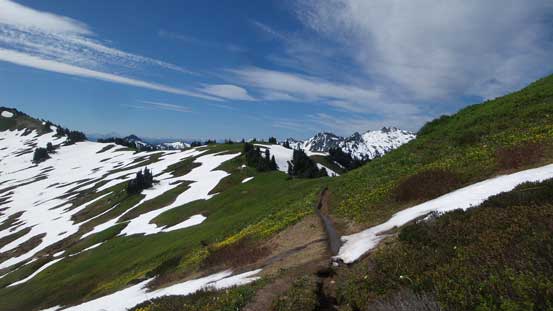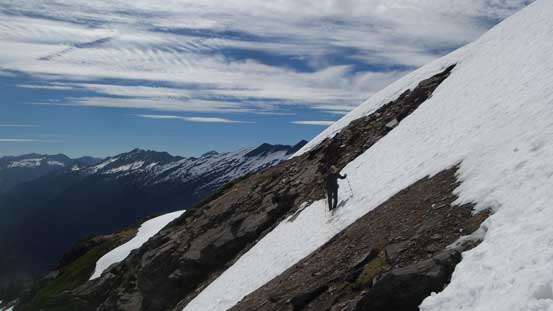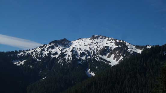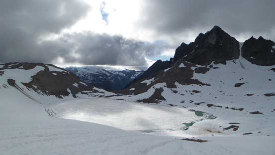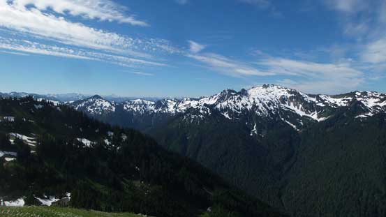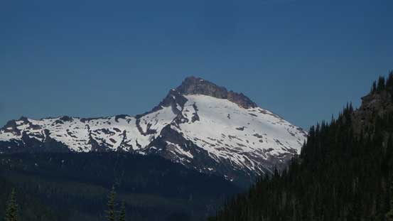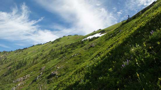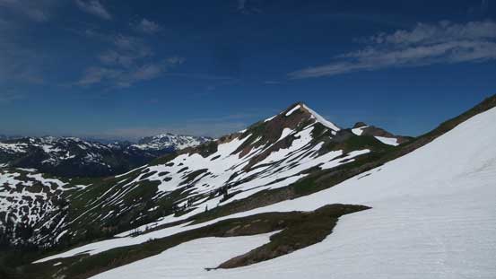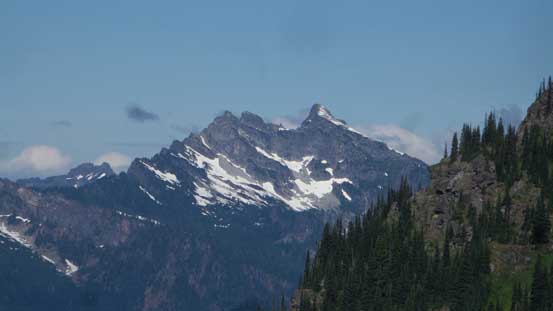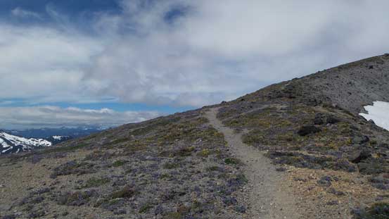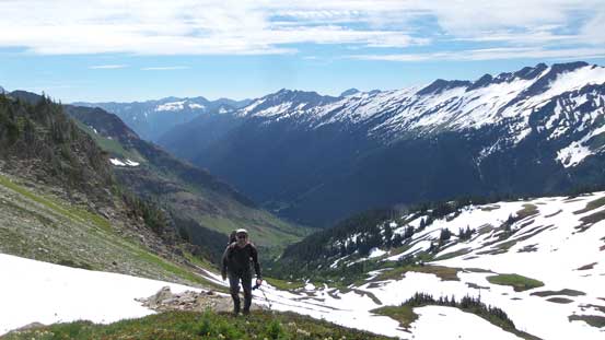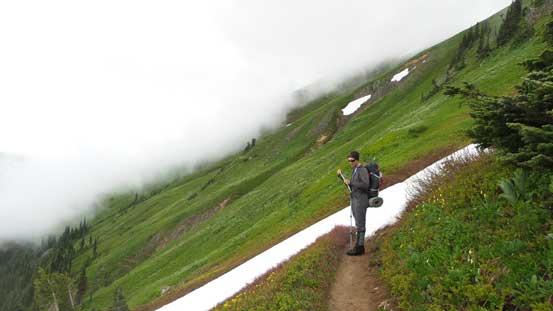 The second stage of this approach is a series of switchbacks up to White Pass. Thankfully much of the trail is high-quality and well-maintained and I managed to wear the trail-runners to pretty high up. Eventually I got sick of the heavy pack so took the 2-kg Nepal Evos out. The last switchback has at least a good mile in its length traversing a long ways due east. The best view was looking back at Sloan Peak. At that time I had no idea, but a month later I went back to Mountain Loop Highway and got Sloan Peak bagged. White Pass was a good place to hang around but we didn’t do so as there’s a cold breeze of wind plus there’s no running water to be found.