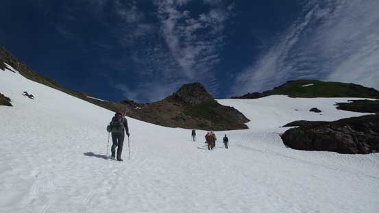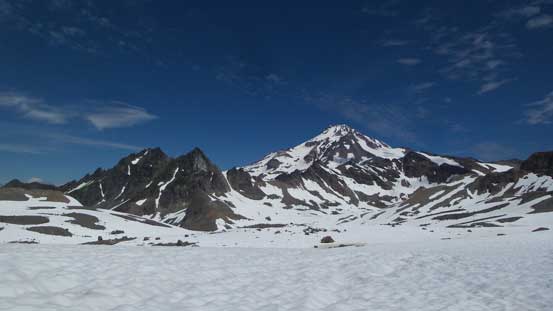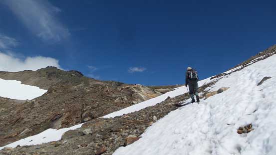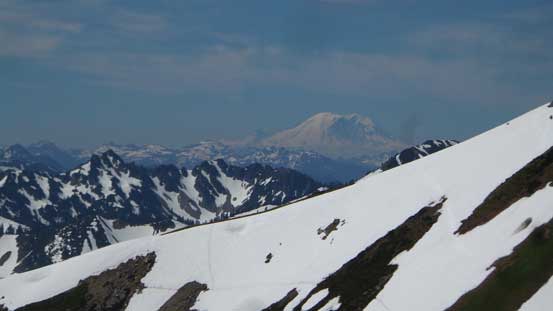 We debated about making an ascent of White Mountain but that’s a foolish idea given that we were pushing to summit Glacier Peak on Day 1, so traversing further east we went. The trail soon became more like a path and then disappeared into some snow slopes. The foot steps from previous parties were still highly distinguishable making easy route-finding for us. The idea was to resist gaining the ridge too soon while traversing across at least two big bowls. Around a broad rib we had to deal with one steep snow slope traverse that required a high degree of concentration. We were too lazy to take ice axe or crampons out so a slip was not an option. It’s pretty obvious where to gain the ridge now as traversing further simple wouldn’t make any more sense. This high col was where we took the second break.