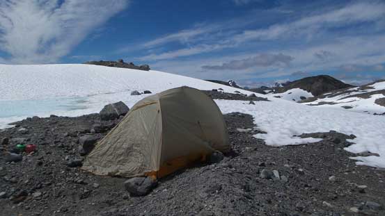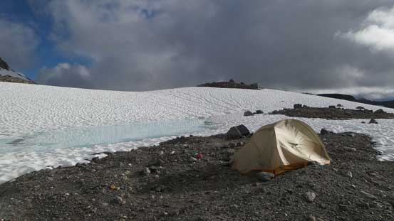 This was also the first time we had sights on our mighty objective – still looking terribly far away so we had to keep plodding. Down into the north side was easy on softened snow and then we picked up the set of tracks again traversing sideways across a couple more bowls. The difference is now we were entirely on snow rather than a mix of grass and snow. The recommended bivy site was right at Glacier Gap but we figured it’s not necessary. We came across a pretty damn good spot about one mile before Glacier Gap and in fact, another party had pitched their tent there. We did the same for simple reason to save 2 extra miles of hauling heavy loads. At this point we were doing pretty good on time so we actually spent that half an hour setting up camp and meanwhile, taking a necessary energy break.