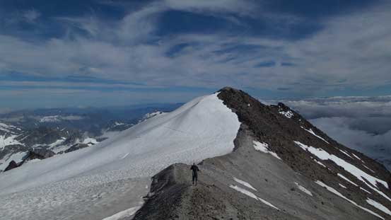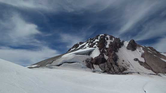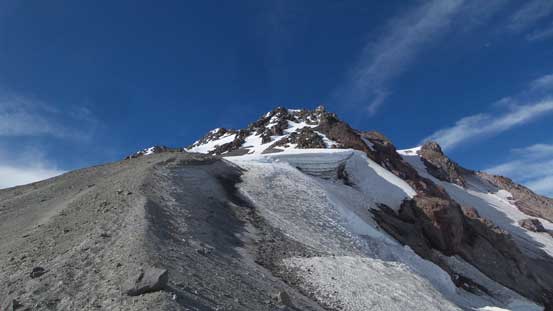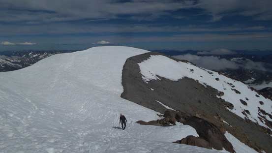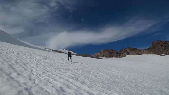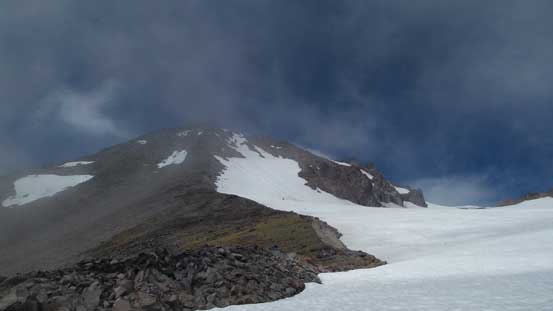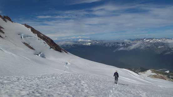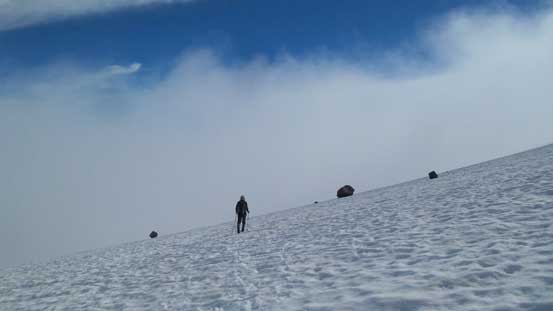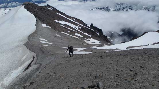 Up we went and again, we had to traverse sideways across a couple more snowy bowls with each one requiring some degree of elevation gain. There’s one major rise done on some moraine type of ground but otherwise it’s an easy plod to Glacier Gap. Quite a few parties pitched their tents at the gap and judging by the emptiness we figured they must have been still on the mountain. There’s a layer of clouds rolling in but at this point we couldn’t do much other than keep plodding. We picked the set of boot tracks up and over the roll ahead with at least 50 m of gain and loss and then we finally started up the main peak proper. It’s also interesting that some sections along the broad south ridge was done on dry, loose volcanic ash type of ground. This was good as after a long day plodding on snow I greatly appreciated some degree of variation. At one point we ditched some food/water and then bailed to the climber’s right side onto snow followed by a long diagonal march across Gerdine Glacier aiming at the col east of Disappointment Peak.