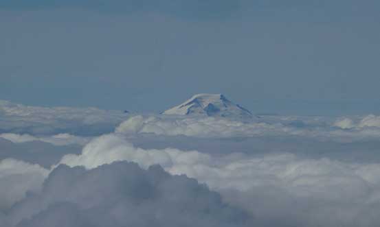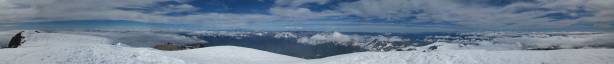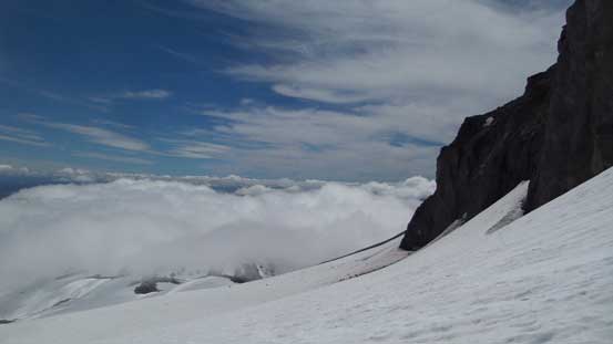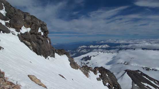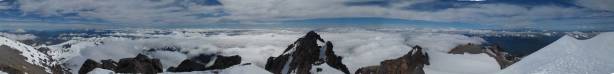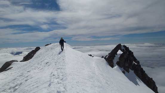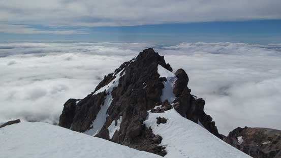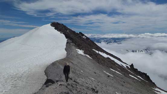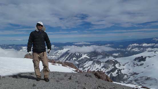 The first half of the final summit push was done on loose volcanic ash but the previous traffics had packed down a zig-zagging trail so we didn’t have to deal with treadmill scree. That was good. Higher up we merged onto snow and this time, the grade was pretty steep but again, the previous parties had done a great job kicking the steps for us. There’s no need to use any special equipment neither and soon enough we topped out. There were two highpoints and we checked them all off just to be sure, but I think the right (east) bump is the true summit. Apart from the taller Bulger peaks there’s not much else to see thank to the layer of low clouds. This was actually my first volcano done with a layer of low clouds so that was very cool nonetheless.