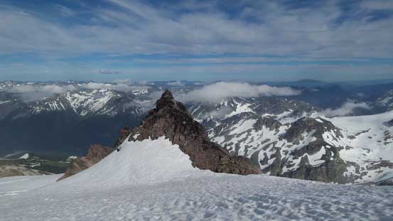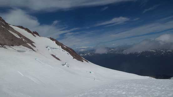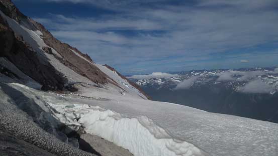 Around the high col we merged onto the second glacier – Cool Glacier and I have to comment that this is a real glacier with lots of crevasses to be aware of. Mid-July was almost too late in the season and right off the bat we had to cross a major crevasse on snow bridges. Having no rope nor equipment we just simply followed the previous parties tracks but had it been thinner I would certainly want to have a bit of safety back-ups. After the crevassed zone we trended slightly climber’s left up Cool Glacier and again, while simply following the other parties’ tracks. Higher up underneath the summit block of Disappointment Peak we crossed path with a roped party-of-three. Later I found out that the leader was the legendary Ed Kenny from Washington Hikers and Climbers. That was quite a cool experience on Cool Glacier but soon enough we reached Glacier/Disappointment saddle and then onto rock gain.