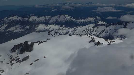 Tired but we had to keep going as the time was slowly getting on. Thankfully much of the descent would be done while plunging down on snow. This was very easy on our knees. For the first part down towards Disappointment/Glacier saddle we really took our time soaking in the views. At the saddle we decided to bag Disappointment Peak as well for simple reason of why-not. There’s no way would I come all the way back here for just Disappointment Peak so it’s a now-or-never kind of thing. After that short detour we continued plunging down Cool Glacier and then Gerdine Glacier. Lower down we entered that layer of mist and had to navigate a good stretch in a white-out. The GPS came handy and soon we joined the lower south ridge and followed it down to the low saddle without much of an issue. We caught up with Ed’s group there and after a brief talk we continued onwards.
