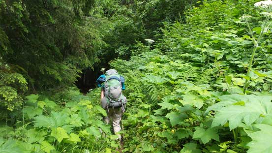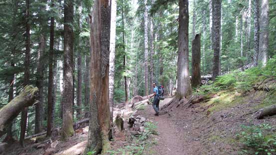 The next morning we woke up in a pitch dark and got going just when it’s bright enough to not require the use of head-lamps. The first 5 miles down the trail was pretty much next to flat and felt almost exactly like the approach on Mt. Olympus, albeit much shorter this time. I opted to use trail-runners for this portion and that turned out to be a good call. The trail might not be as tame as you think thank to a couple overgrown stretches (crossing avalanche paths). We literally had to push through the thick bush and then got soaked in no time thank to the heavy morning dew. Lots of four-letter words were flying around and good thing I brought two pairs of socks. The next thing we arrived at Mackinaw shelter but that thing was old and very ugly-looking. We were not in the mood of lingering so pushed onwards without doing much of a stop at all. Another kilometer later we took a break right before the first switchback.