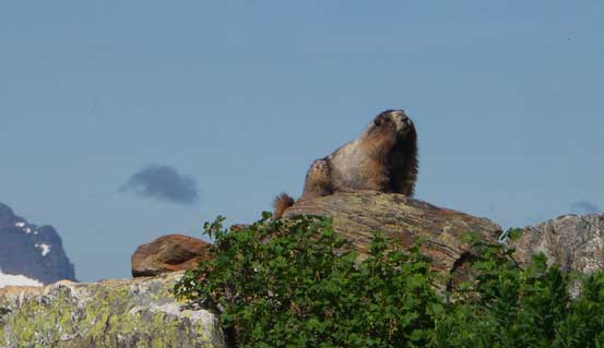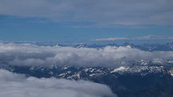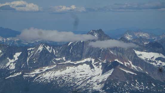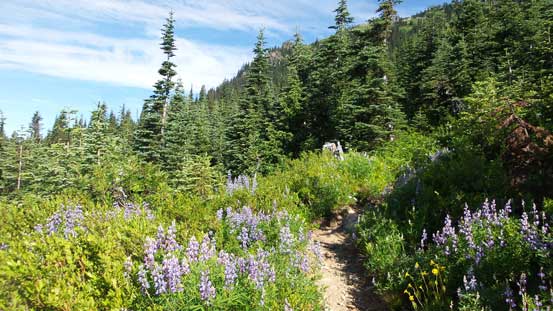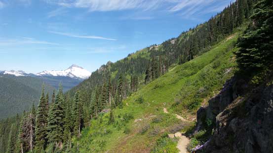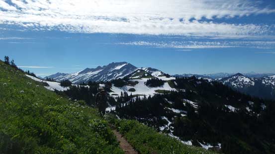 The second stage of this approach is a series of switchbacks up to White Pass. Thankfully much of the trail is high-quality and well-maintained and I managed to wear the trail-runners to pretty high up. Eventually I got sick of the heavy pack so took the 2-kg Nepal Evos out. The last switchback has at least a good mile in its length traversing a long ways due east. The best view was looking back at Sloan Peak. At that time I had no idea, but a month later I went back to Mountain Loop Highway and got Sloan Peak bagged. White Pass was a good place to hang around but we didn’t do so as there’s a cold breeze of wind plus there’s no running water to be found.