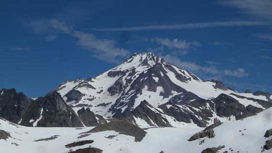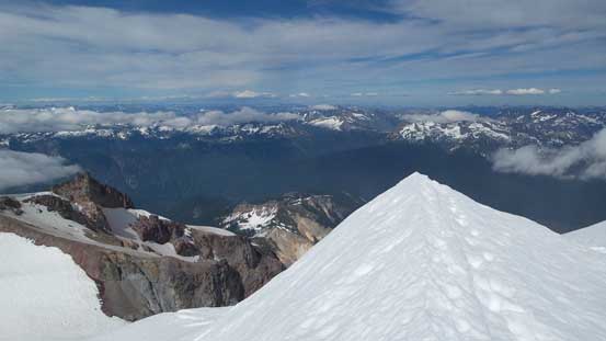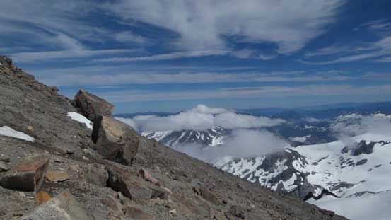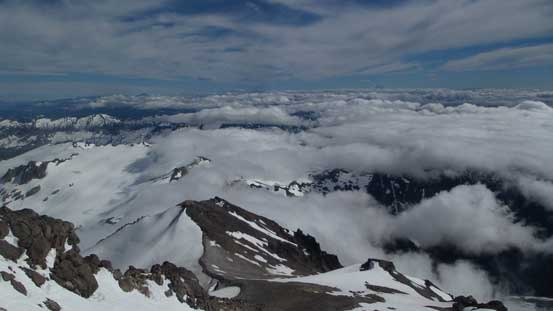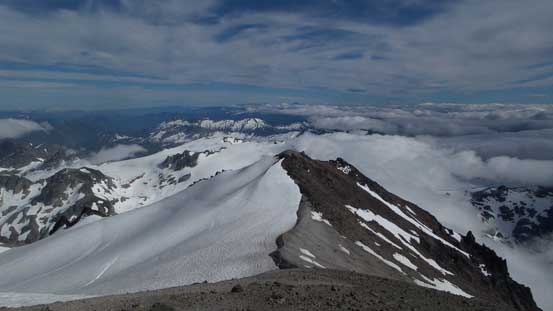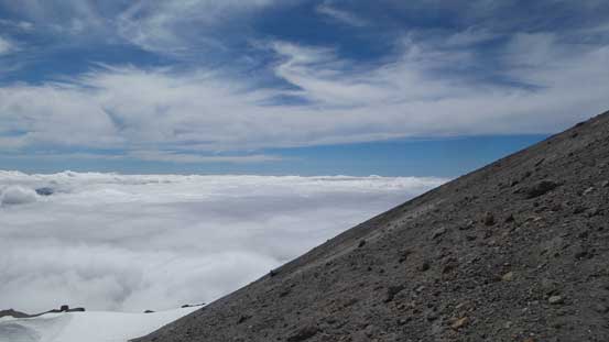 The first half of the final summit push was done on loose volcanic ash but the previous traffics had packed down a zig-zagging trail so we didn’t have to deal with treadmill scree. That was good. Higher up we merged onto snow and this time, the grade was pretty steep but again, the previous parties had done a great job kicking the steps for us. There’s no need to use any special equipment neither and soon enough we topped out. There were two highpoints and we checked them all off just to be sure, but I think the right (east) bump is the true summit. Apart from the taller Bulger peaks there’s not much else to see thank to the layer of low clouds. This was actually my first volcano done with a layer of low clouds so that was very cool nonetheless.
