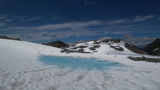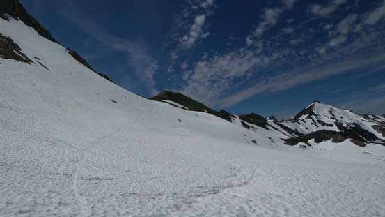 We debated about making an ascent of White Mountain but that’s a foolish idea given that we were pushing to summit Glacier Peak on Day 1, so traversing further east we went. The trail soon became more like a path and then disappeared into some snow slopes. The foot steps from previous parties were still highly distinguishable making easy route-finding for us. The idea was to resist gaining the ridge too soon while traversing across at least two big bowls. Around a broad rib we had to deal with one steep snow slope traverse that required a high degree of concentration. We were too lazy to take ice axe or crampons out so a slip was not an option. It’s pretty obvious where to gain the ridge now as traversing further simple wouldn’t make any more sense. This high col was where we took the second break.