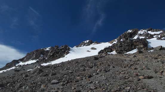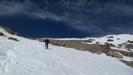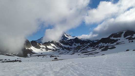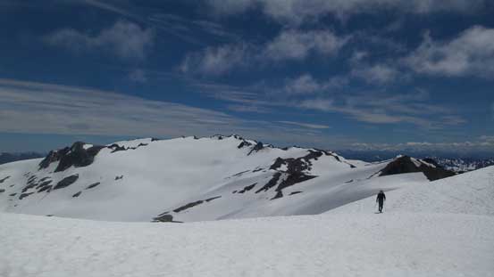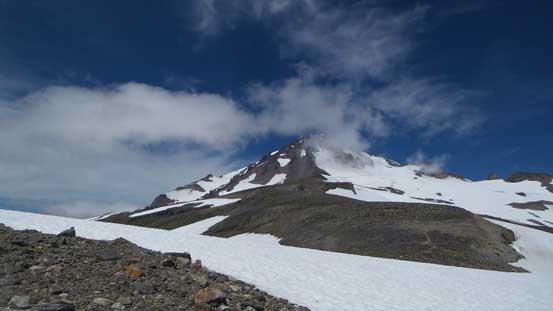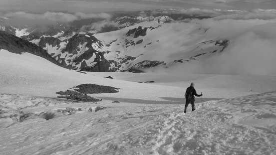 Up we went and again, we had to traverse sideways across a couple more snowy bowls with each one requiring some degree of elevation gain. There’s one major rise done on some moraine type of ground but otherwise it’s an easy plod to Glacier Gap. Quite a few parties pitched their tents at the gap and judging by the emptiness we figured they must have been still on the mountain. There’s a layer of clouds rolling in but at this point we couldn’t do much other than keep plodding. We picked the set of boot tracks up and over the roll ahead with at least 50 m of gain and loss and then we finally started up the main peak proper. It’s also interesting that some sections along the broad south ridge was done on dry, loose volcanic ash type of ground. This was good as after a long day plodding on snow I greatly appreciated some degree of variation. At one point we ditched some food/water and then bailed to the climber’s right side onto snow followed by a long diagonal march across Gerdine Glacier aiming at the col east of Disappointment Peak.