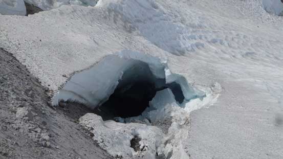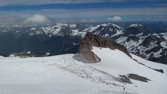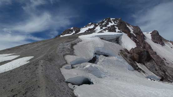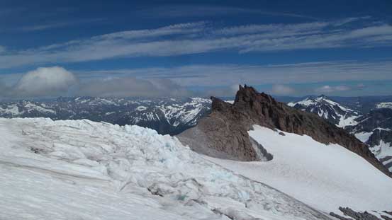 Around the high col we merged onto the second glacier – Cool Glacier and I have to comment that this is a real glacier with lots of crevasses to be aware of. Mid-July was almost too late in the season and right off the bat we had to cross a major crevasse on snow bridges. Having no rope nor equipment we just simply followed the previous parties tracks but had it been thinner I would certainly want to have a bit of safety back-ups. After the crevassed zone we trended slightly climber’s left up Cool Glacier and again, while simply following the other parties’ tracks. Higher up underneath the summit block of Disappointment Peak we crossed path with a roped party-of-three. Later I found out that the leader was the legendary Ed Kenny from Washington Hikers and Climbers. That was quite a cool experience on Cool Glacier but soon enough we reached Glacier/Disappointment saddle and then onto rock gain.