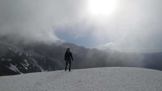 Tired but we had to keep going as the time was slowly getting on. Thankfully much of the descent would be done while plunging down on snow. This was very easy on our knees. For the first part down towards Disappointment/Glacier saddle we really took our time soaking in the views. At the saddle we decided to bag Disappointment Peak as well for simple reason of why-not. There’s no way would I come all the way back here for just Disappointment Peak so it’s a now-or-never kind of thing. After that short detour we continued plunging down Cool Glacier and then Gerdine Glacier. Lower down we entered that layer of mist and had to navigate a good stretch in a white-out. The GPS came handy and soon we joined the lower south ridge and followed it down to the low saddle without much of an issue. We caught up with Ed’s group there and after a brief talk we continued onwards.