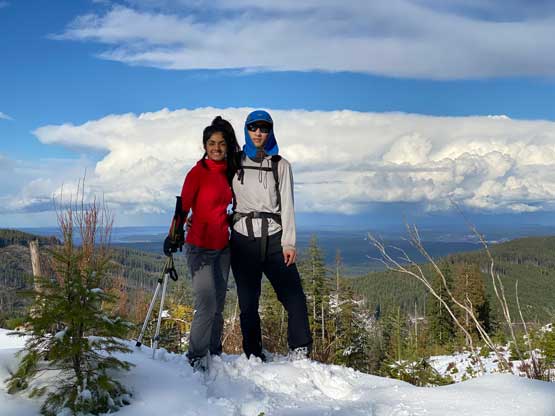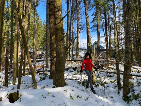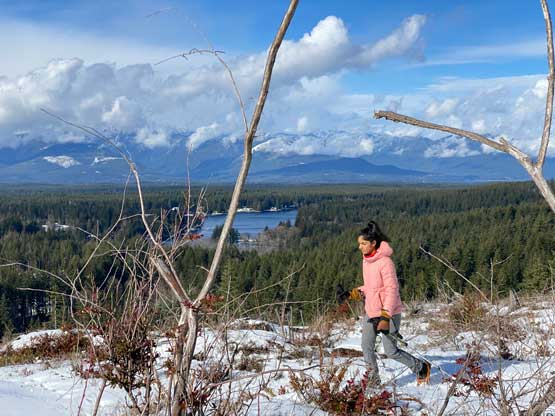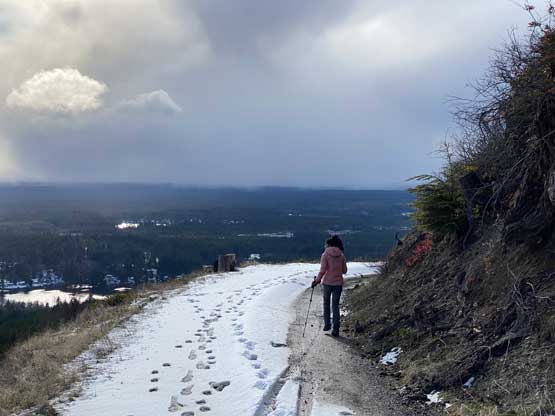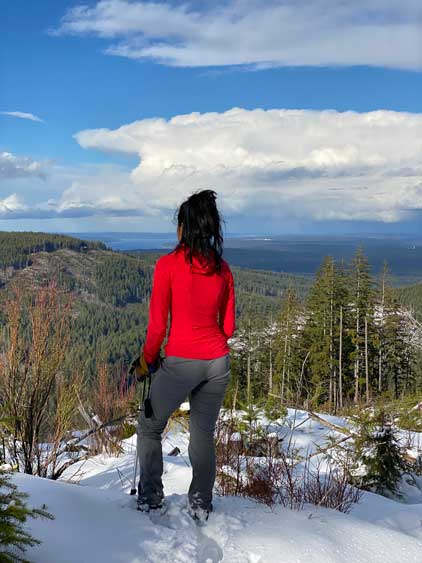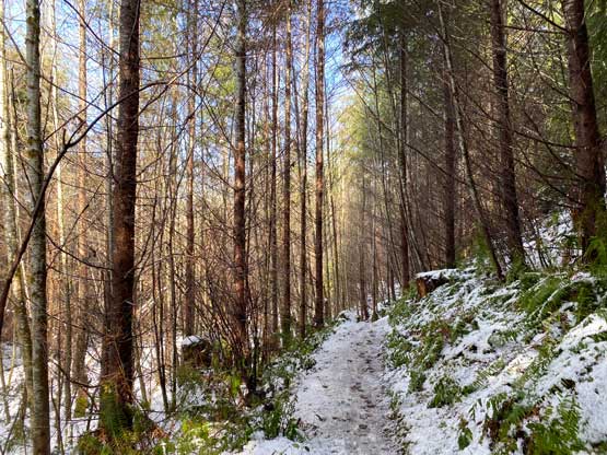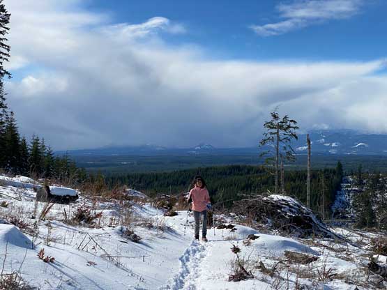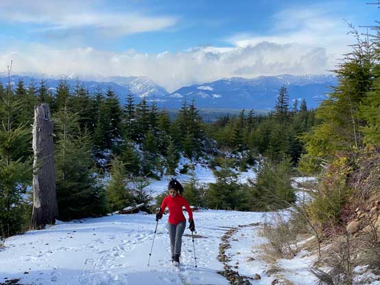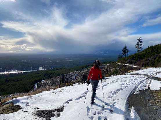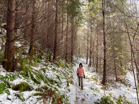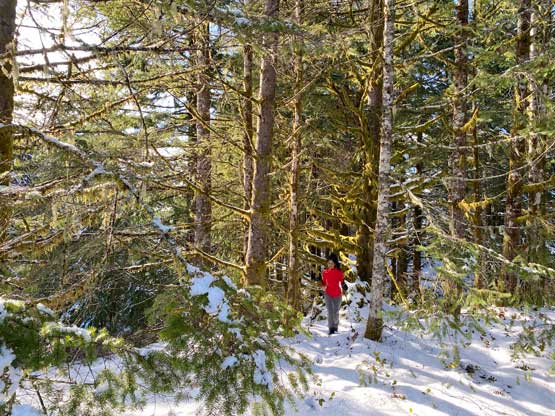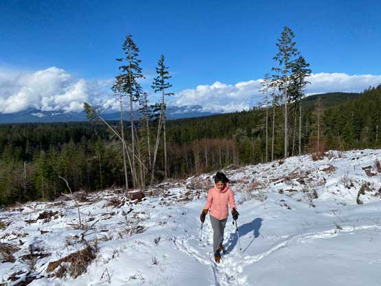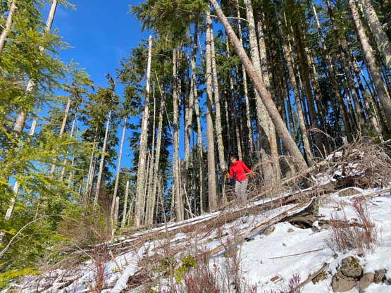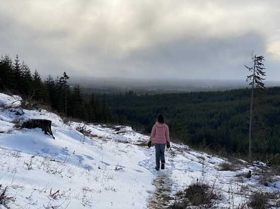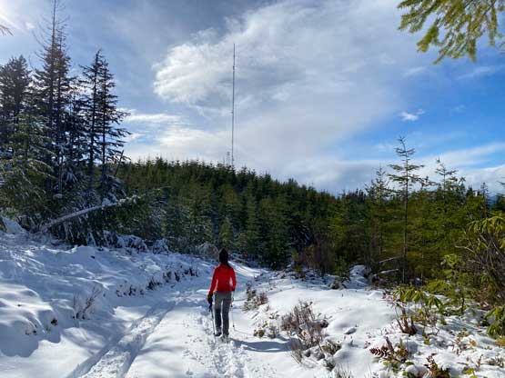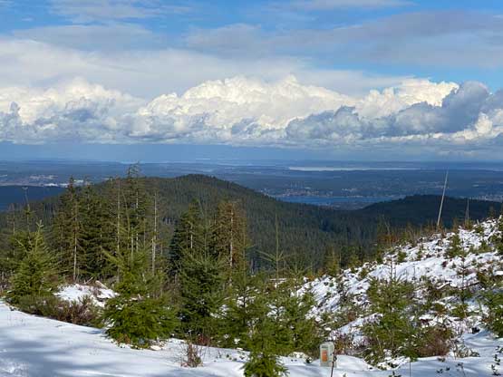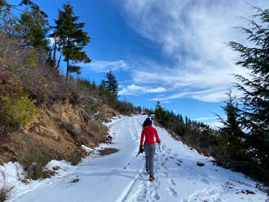 The standard approach is via Tin Mine Trail from the west and we decided to take that as well. Nikita and I drove straight to the trail-head after completing an ascent of Mt. Walker earlier in the morning. The drive between the two trail-heads took an hour. There was at least 20 cm of fresh snow but we opted to leave the snowshoes in the car. Mt. Walker was 300 m taller and didn’t require us to use snowshoes so we were confident that they wouldn’t be needed here. In retrospect the snowshoes would actually come handy on the long FSR slog if not because of the biker and trail-runner’s tracks. The previous night’s storm had dumped more snow here than in the eastern parts of the Olympics.
