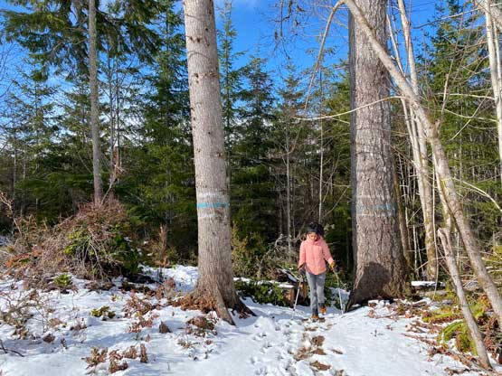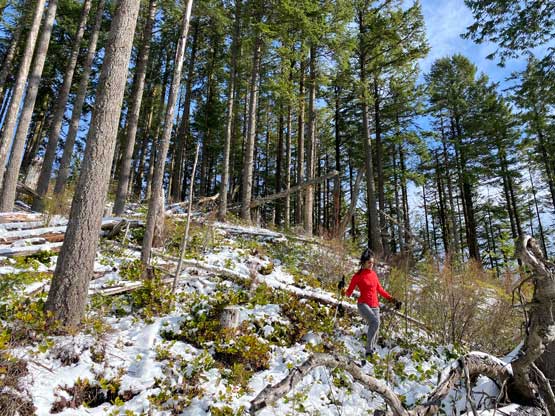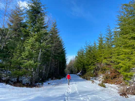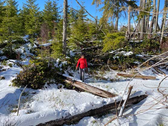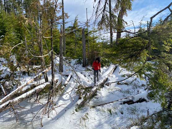 Our reference track made a contrived detour to the east side of the summit area because he/she wanted to follow the roads all the way. I, on the other hand, had just learnt something from Matt J. that sometimes it’s better to ignore the “standard route”. I was frustrated about the monotonous post-holing so triple-checked the maps and made a spontaneous decision to directly attack the westernmost of the three summits by bushwhacking. Later at home I read elsewhere that bushwhacking on this mountain was “strongly advised against” but I couldn’t understand. The bushwhacking was definitely annoying but not that bad, even with half a foot of fresh snow to make things wet and slippery. There’s one short stretch of swampland that we crossed using two wet logs, some pick-up sticks and one unexpected bump that required us to lose 10 meters of “hard won” elevation but that’s it. After visiting the first (westernmost) summit I also made a bushwhacking short-cut to the second (supposedly true) summit. We also checked the meaningless easternmost summit just to be 100% sure and then went back up to the first summit. This time we bypassed the middle summit using the road on the south side.