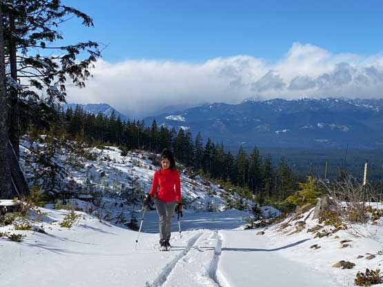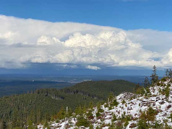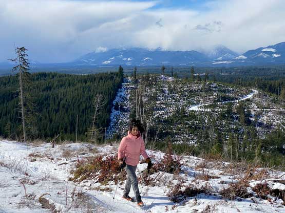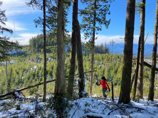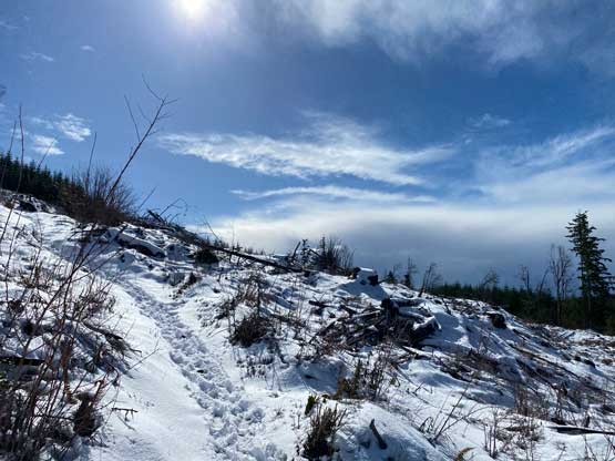 There are lots of trails on the lower flanks of this peak and I mostly just followed the downloaded GPX tracks from the previous peakbagger’s reports. None of us came here with any detailed research so we were heavily relying on the technology for navigation. The trail actually ascends a large and open cut-block with views to the west, then brought us to the long FSR system on Gold Mountain’s west flanks. The hiking on the FSRs might seem boring but the road was open enough to grant views here and there. We crossed path with a trail-runner with his dog, and an electric-biker and both of them were on the descent. Without their tracks we would be post-holing quite heavily. The trail-runner’s track stopped a couple kilometers short from the summit but the biker’s track continued further.