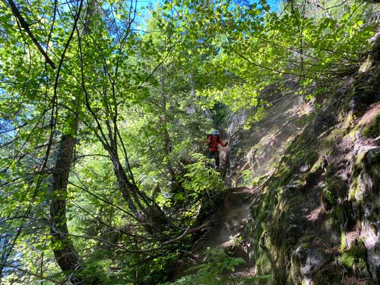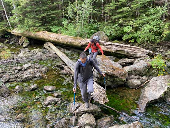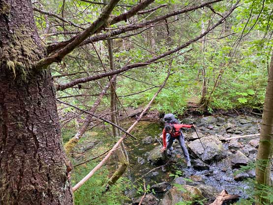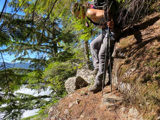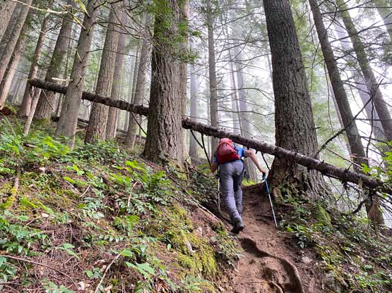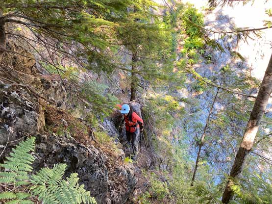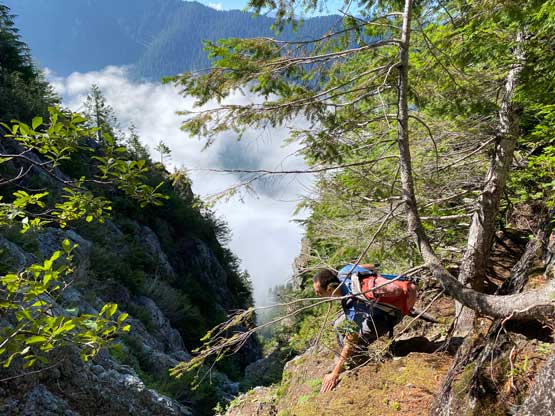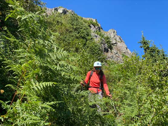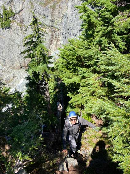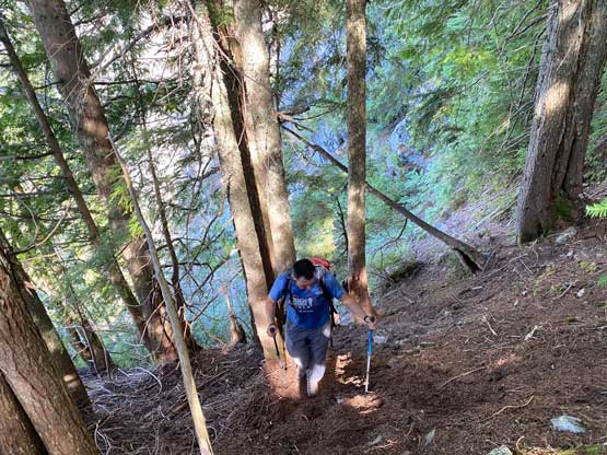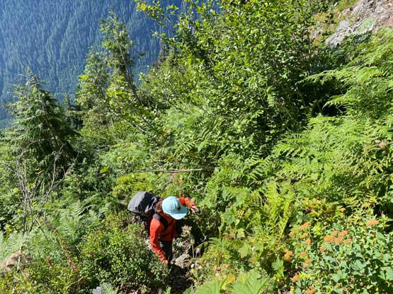 The “beta” of this peak is overwhelmingly detailed on the internet such that I decided to just download a few sets of GPS tracks and use our own navigation sense. In this modern era with GPS technology one really does not need to provide information like “200 yards in then turn left”. It’s much more useful to just provide a track log for the public to download. After crossing two streams on slippery rocks and navigating a few confusing junctions we came to the lower part of the climber’s trail which was more like something in the North Shore Mountains of Vancouver. It was steep but the trail-bed was clear. Higher up we traversed rightwards across a rocky section with minor down-climbing and scrambling. We accidently down-climbed a 3rd class and exposed chute but we quickly regained the trail and made a mental note for the return. The trail beyond that was overgrown but still mostly easy to follow. Many people commented on how bad the bushwhacking was, but I wouldn’t even call this “bushwhacking” as we were entirely on a trail with very clear foot bed. We also did a few optional scrambling steps to the left or right of the path, mostly to add some fun time into the otherwise monotonous slog fest.