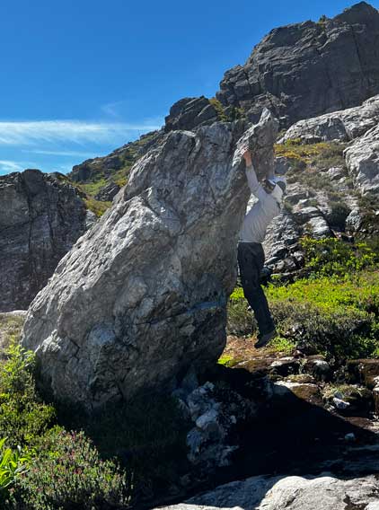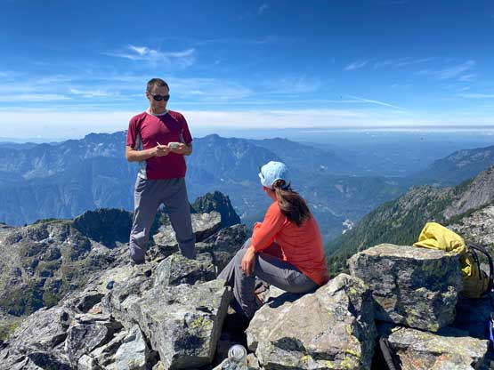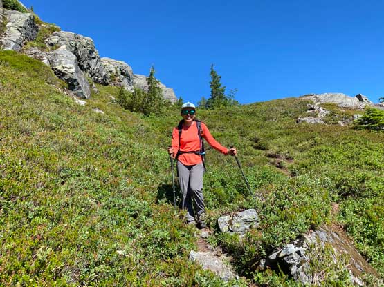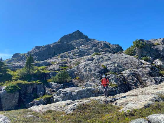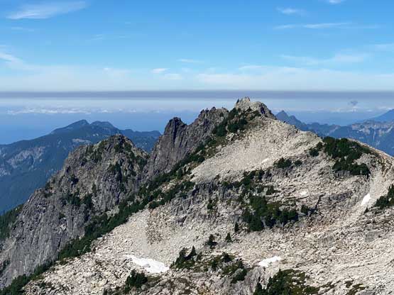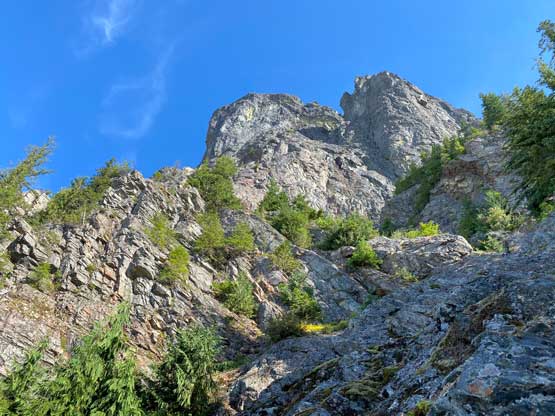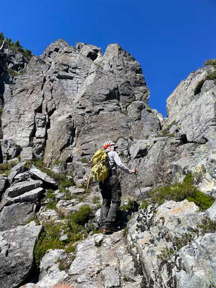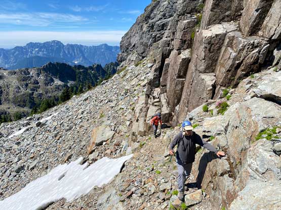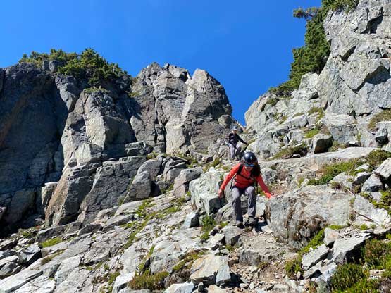 There’s an unavoidable boulder field to ascend which took a while. We then located the correct “hidden ramp”. I’m not sure what’s the standard way to get into the ramp but we opted for a route climber’s right of the fall line. The terrain appeared drier on that side but the scrambling was class 3 with moderate exposure and some loose rocks. The rest of the scrambling to exit this ramp was straightforward and we could even follow a path here through the vegetation. We then easily traversed/ascended to the high notch on the east ridge. The ledge traverse on the north side of the east ridge was rather trivial (in fact, just a walk) and we were soon standing on the summit soaking in excellent views.