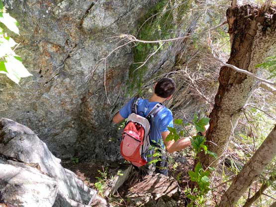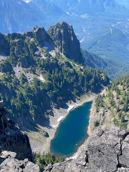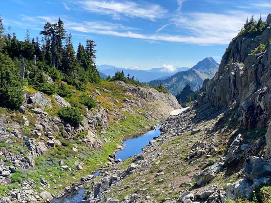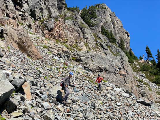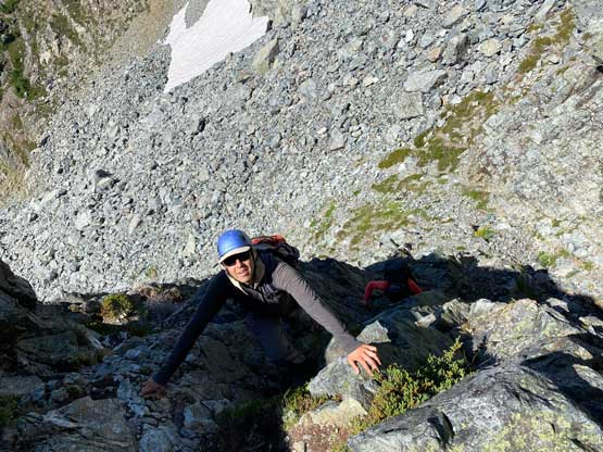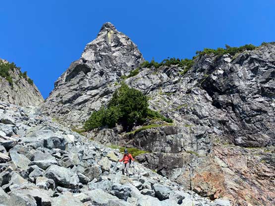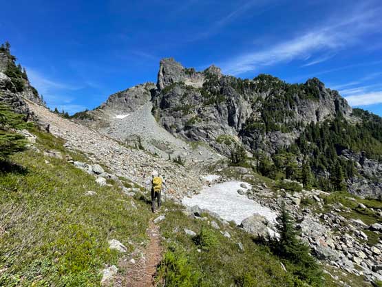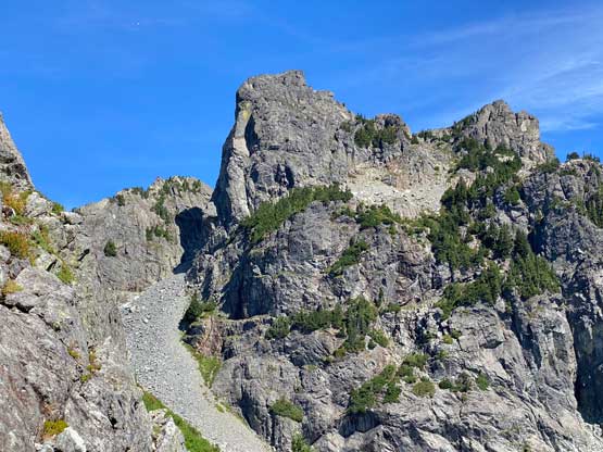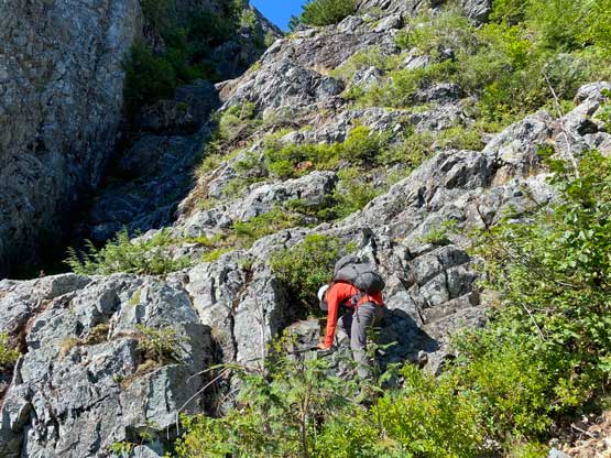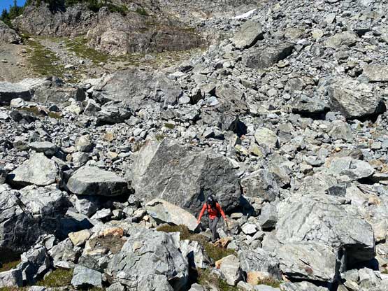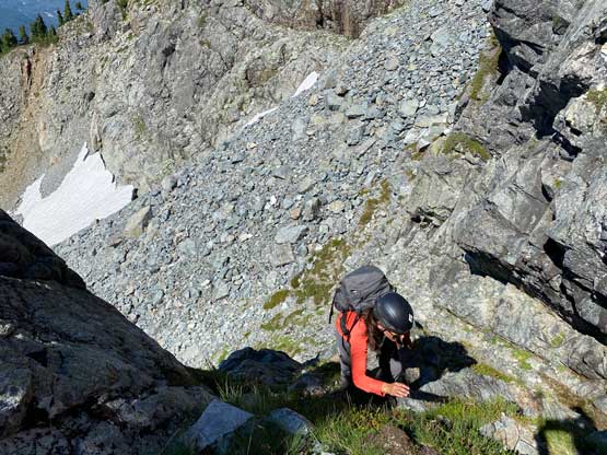 We followed the path bypassing Infinity Tarn without even realizing that but we made a note to check that out on the descent, which turned out to be very worthwhile. There’s then a minor gully to descend into. The trail takes a more roundabout route but we said to just down-climb straight into it for more fun (class 4 and slippery). We then worked our way around the east slopes of “Tailgunner” and made another annoying long descent and traverse to the base of Gunn Peak’s upper mountain. We finally decided to take a needed break before committing to the scramble.