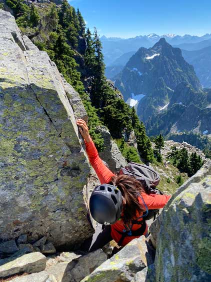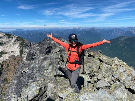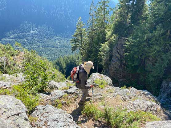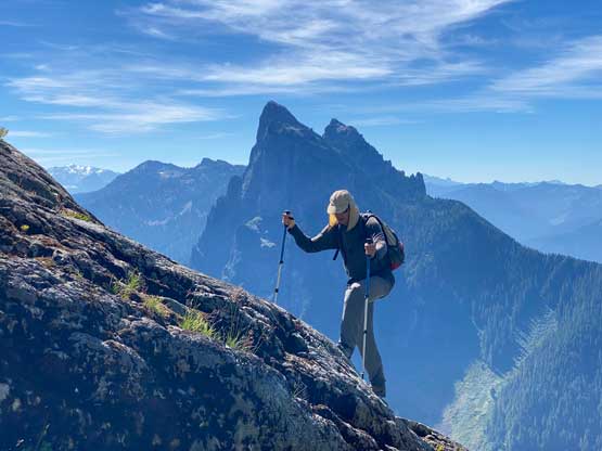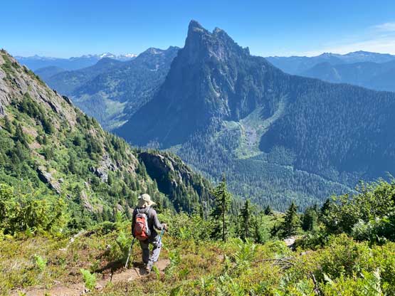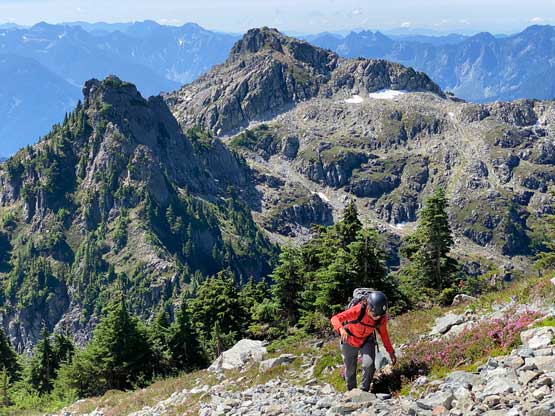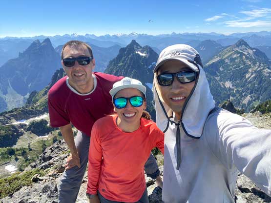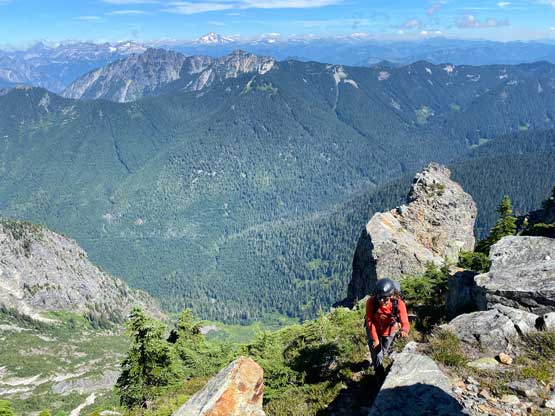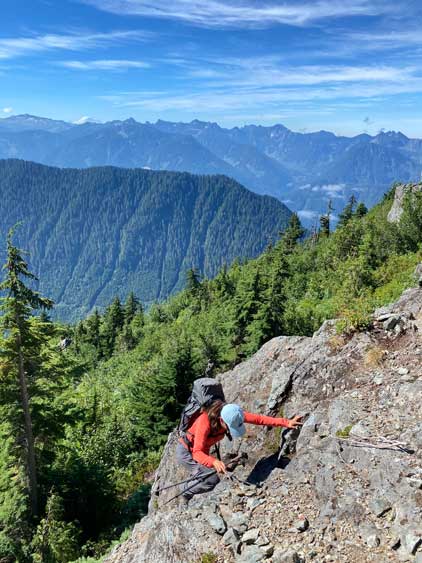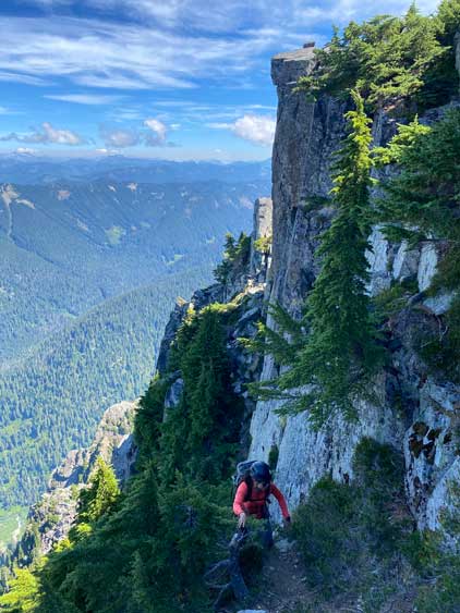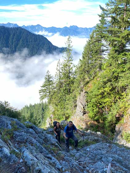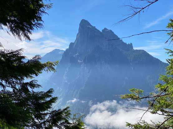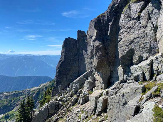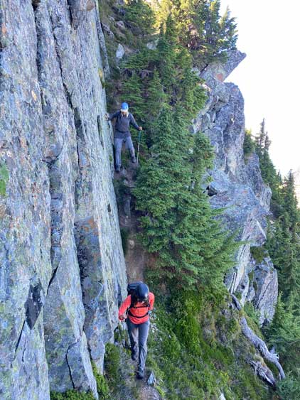 Gunn Peak is the highest summit in Wild Sky Wilderness and hence boasts over 1000 m prominence. This peak locates not far away from Index and the area is very rugged with several known hard summits. The standard route on Gunn Peak is however, not difficult but it still takes most of a day for most parties and the terrain is decently steep and rugged. There’s a climber’s trail to facilitate the access but this isn’t the typical Washington’s hiking trail. Vlad, Silvana and I came from BC and found this trail to be rather pleasant but that’s because we had very low expectation about the trail quality. We also anticipated some tricky and exposed scrambling on the upper mountain but other than a few moves at the beginning of the “hidden ramp” we found the ascent to be rather trivial.