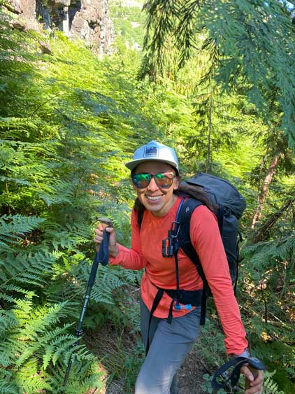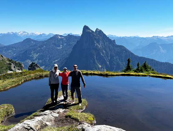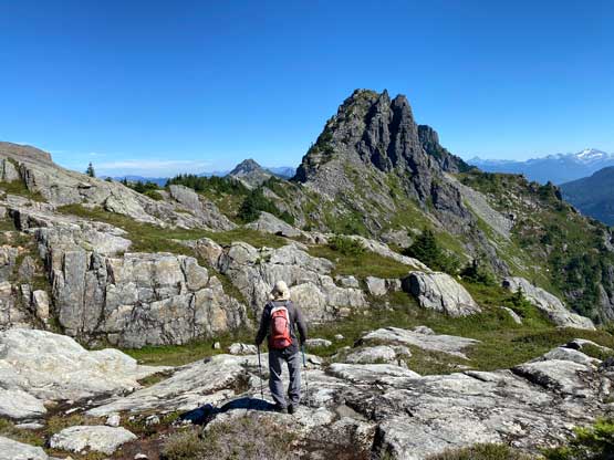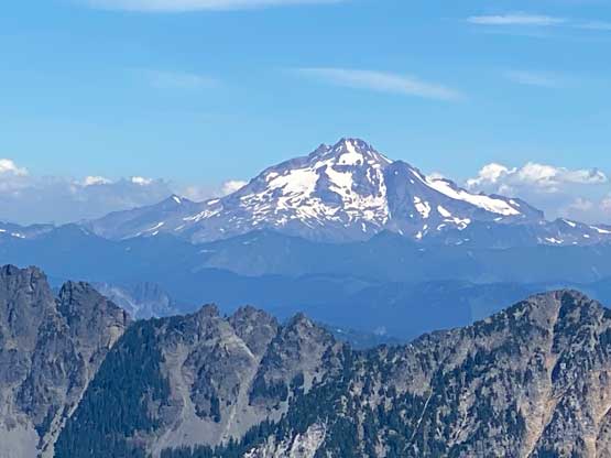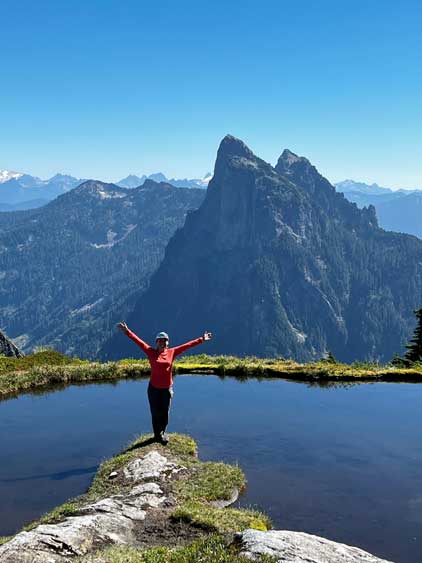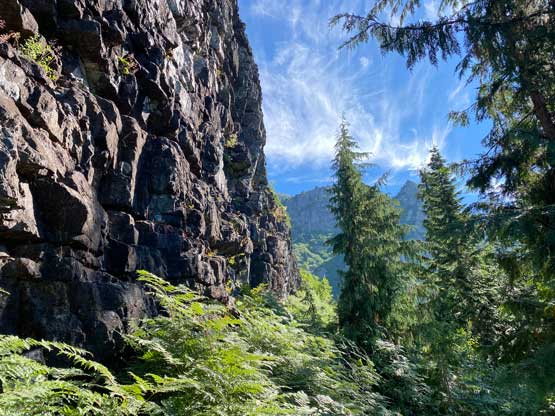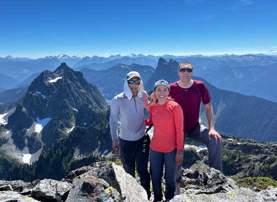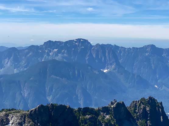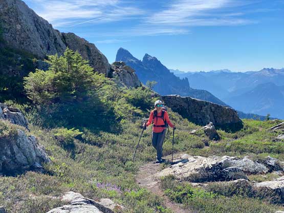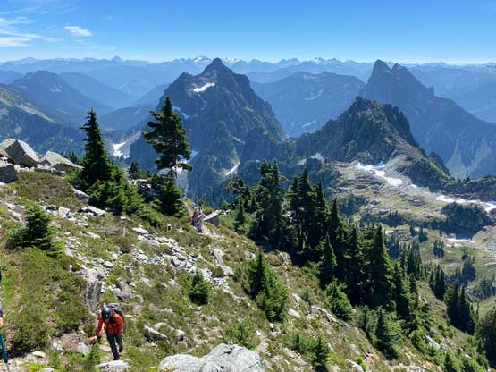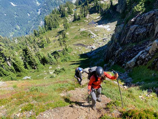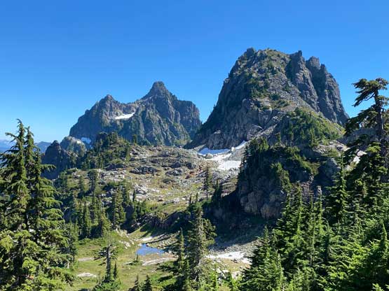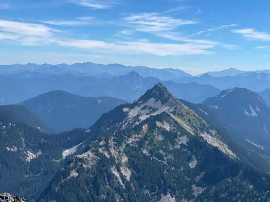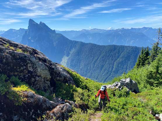Gunn Peak is the highest summit in Wild Sky Wilderness and hence boasts over 1000 m prominence. This peak locates not far away from Index and the area is very rugged with several known hard summits. The standard route on Gunn Peak is however, not difficult but it still takes most of a day for most parties and the terrain is decently steep and rugged. There’s a climber’s trail to facilitate the access but this isn’t the typical Washington’s hiking trail. Vlad, Silvana and I came from BC and found this trail to be rather pleasant but that’s because we had very low expectation about the trail quality. We also anticipated some tricky and exposed scrambling on the upper mountain but other than a few moves at the beginning of the “hidden ramp” we found the ascent to be rather trivial.