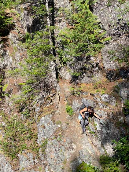 Gunn Peak is the highest summit in Wild Sky Wilderness and hence boasts over 1000 m prominence. This peak locates not far away from Index and the area is very rugged with several known hard summits. The standard route on Gunn Peak is however, not difficult but it still takes most of a day for most parties and the terrain is decently steep and rugged. There’s a climber’s trail to facilitate the access but this isn’t the typical Washington’s hiking trail. Vlad, Silvana and I came from BC and found this trail to be rather pleasant but that’s because we had very low expectation about the trail quality. We also anticipated some tricky and exposed scrambling on the upper mountain but other than a few moves at the beginning of the “hidden ramp” we found the ascent to be rather trivial.