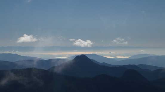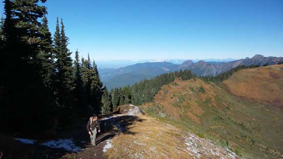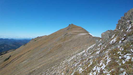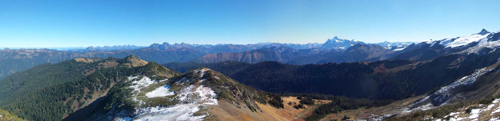 The ascent of Hadley Peak is basically a long ridge walk over the many, many bumps on Skyline Divide and then Chowder Ridge, with some loose scrambling near the summit, but most of the ridge traverse is in the alpine (so great views), and for the most important, I could finally skip a good portion of the coastal forest slog thank to the logging road that brought us perhaps 1000 vertical meters up from the valley floor. In 45 minutes we broke out of the trees and arrived at the first highpoint of the day. We could see the ridge of Skyline Divide winding its way onwards and our objective a LONG way in the distance, but given the perfect autumn weather our spirit was high. Following this popular trail we managed to skip a couple bumps along the way by staying on the sides.